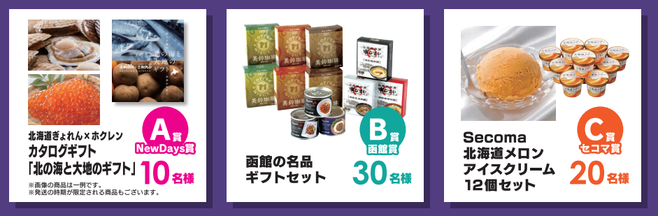 「北海道フェア」対象商品1品以上を含む、600円(税込)以上ご購入のレシートに発行されるIDでご応募いただくと、北海道名産品のカタログギフト、函館の銘品ギフトセット、Secomaのアイスクリームセットが抽選で当たるプレゼントキャンペーンを実施いたします。