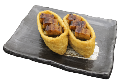 国産うなぎの蒲焼をいなり寿司にトッピング。片手でつまめるおいしさです。
