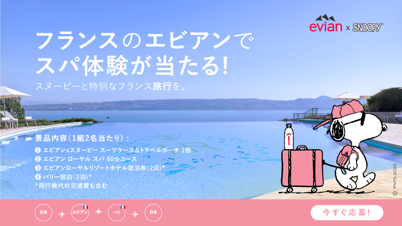 フランス エビアンの町とパリを巡る1週間のラグジュアリーな旅が当たるキャンペーンを7月1日(土)から7月31日(月)まで実施します。抽選で1組2名様に、エビアン・リゾート内の5つ星ホテル「ホテル ロイヤル(2泊)」宿泊券と「エビアン スパ」の特別なリゾートスパ体験(60分コース)をプレゼントします。さらに、パリでの宿泊(3泊)、エビアン® xスヌーピーデザインのスーツケースとトラベルポーチ各1個もプレゼントします(往復航空券/交通費含む)。キャンペーン期間中、エビアン®公式ツイッターアカウントをフォロー&リツイートした方が抽選の対象となります。エビアン®とスヌーピーと一緒に、心も体もリフレッシュして、暑い夏を楽しくヘルシーに過ごしましょう。