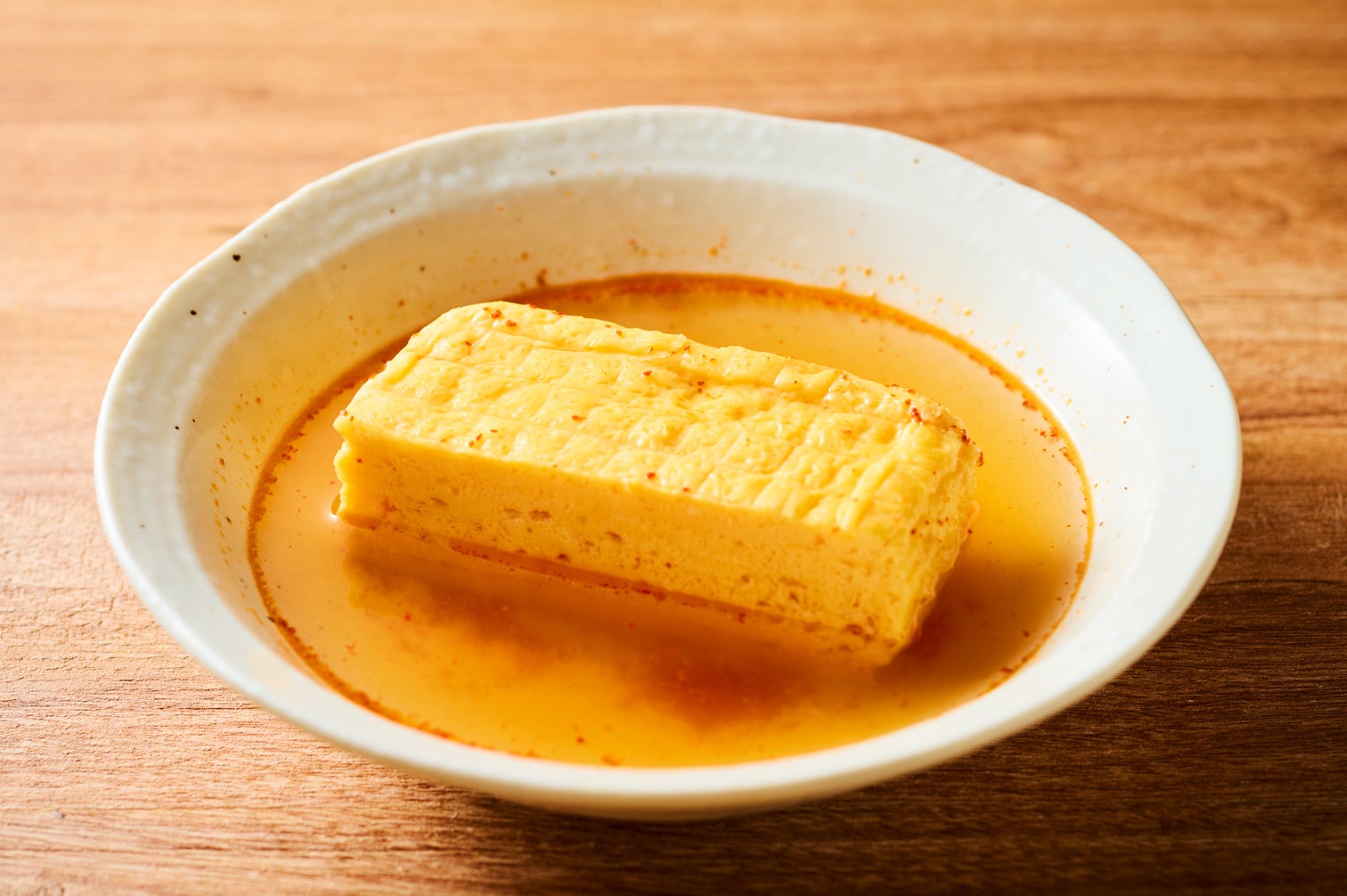 コクのある辛い一味出汁を濃厚で甘みのある玉子と一緒に味わえます。辛おでん:手羽先¥150-