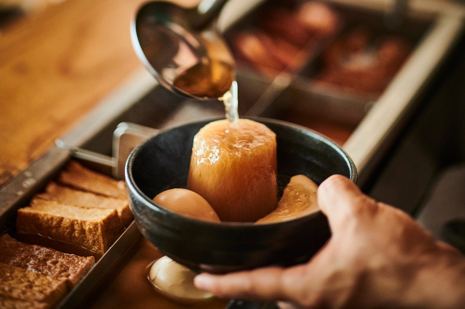 「出汁と旬食材をこだわればおでんは365日美味い」がコンセプトで自慢のオリジナル鱧出汁は様々な食材を活かし食材の旨味と融合し『出汁までおいしく飲めるおでん』に仕上げています。 こだわりの卓上の薬味 (特製濡れ一味、柚子胡椒、辛子、メリッサ) お通し代わりに提供するオリジナル薬味 ( ねぎ醤油と山わさび ) で お客様好みにカスタム、それぞれのタネにあった薬味の使い分けで楽しみ方を演出しています。