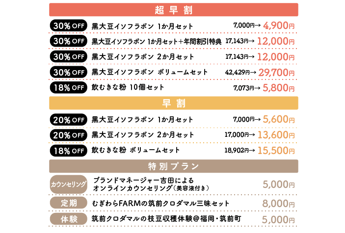 植物性タンパク質豊富で保存料、香料、着色料が無添加のスイーツに。きな粉のほか、むぎわらFARMでつくった特別栽培米のお米をベースに、ノンアルコール甘酒とミネラル塩のみが原材料のとことん身体にやさしいインナーケアドリンクが完成しました。原料美容液と一緒に、外側からも中からも「筑前クロダマル」の魅力をお楽しみください。