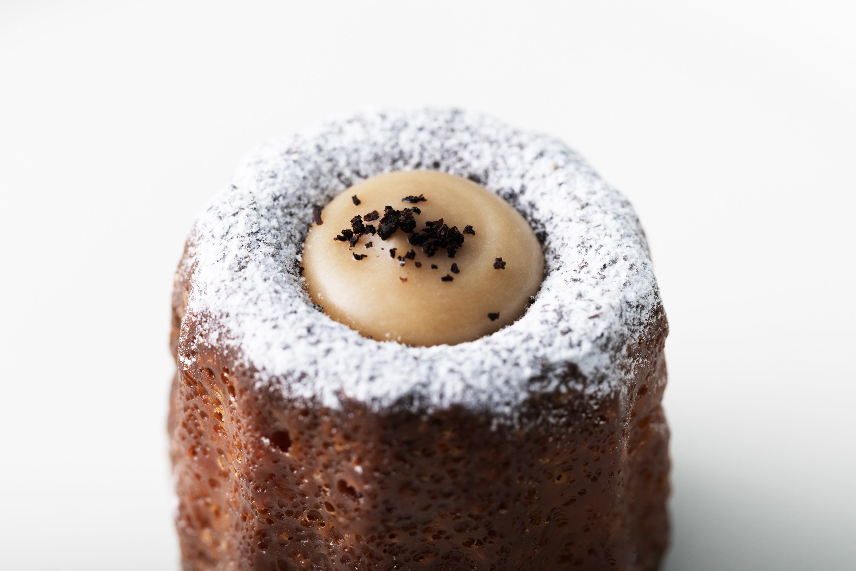 デコレーションに使用されているのは、アールグレイ風味のホワイトチョコレートクリーム。なめらかな口どけと濃厚な甘さが、カヌレ本体のアクセントに。チョコレートクリームの上部に散りばめられたアールグレイ茶葉は香り高く、ひとくち目の華やかな風味を演出します。