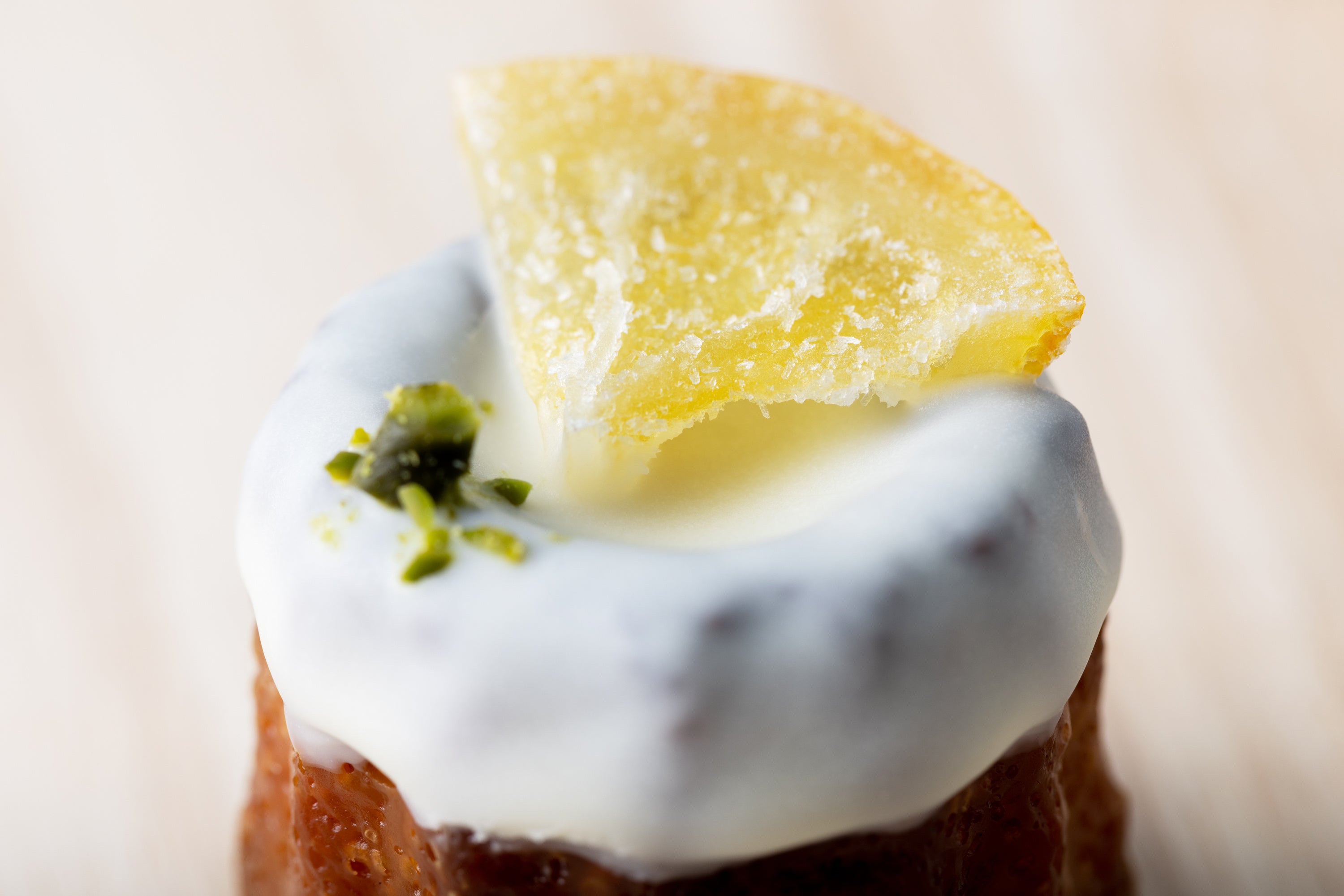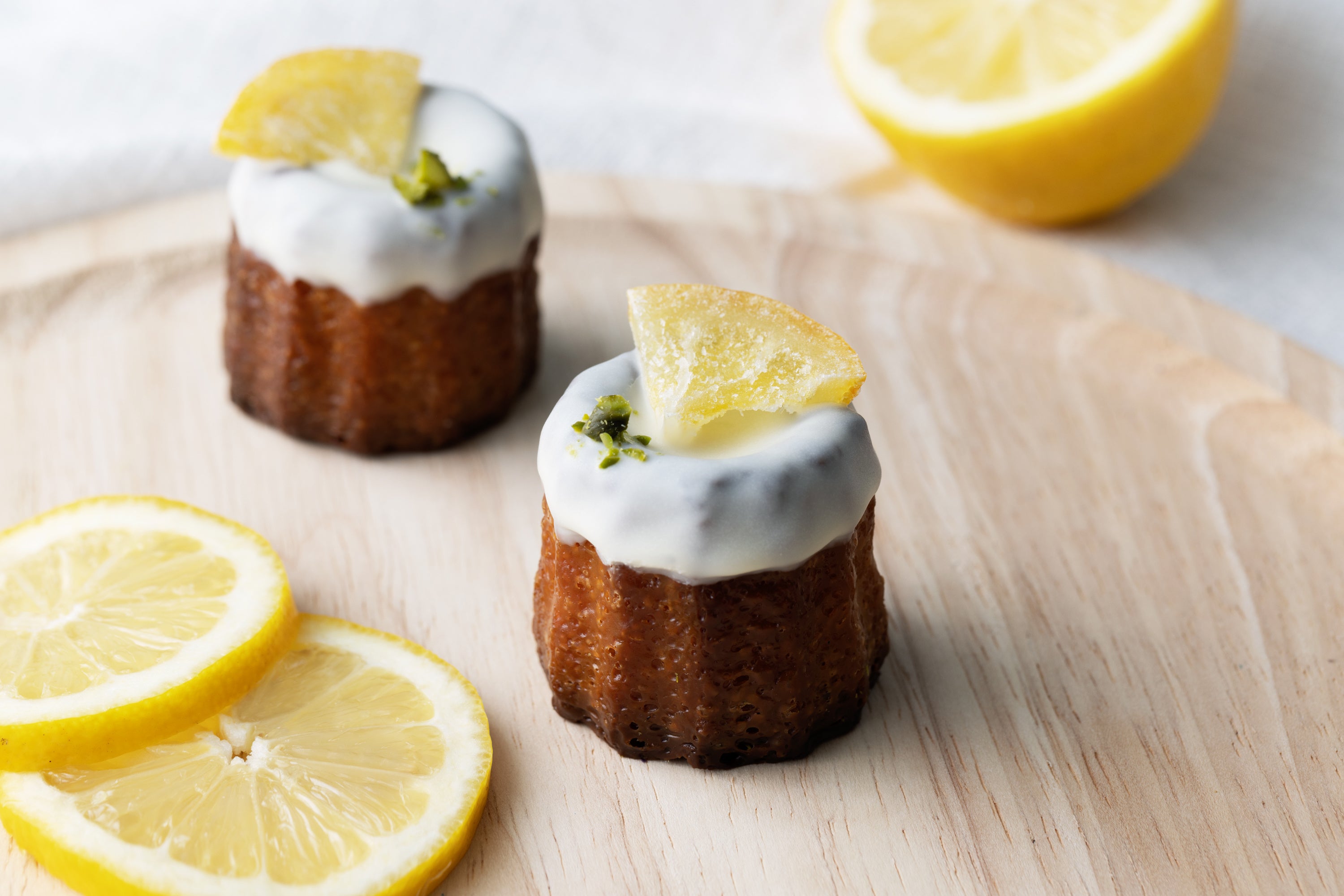 天面には、見た目が鮮やかなピスタチオに加え、シロップ漬けの皮付きレモンをトッピング。しっかりとしたレモンの果肉感があり、夏らしいカヌレです。