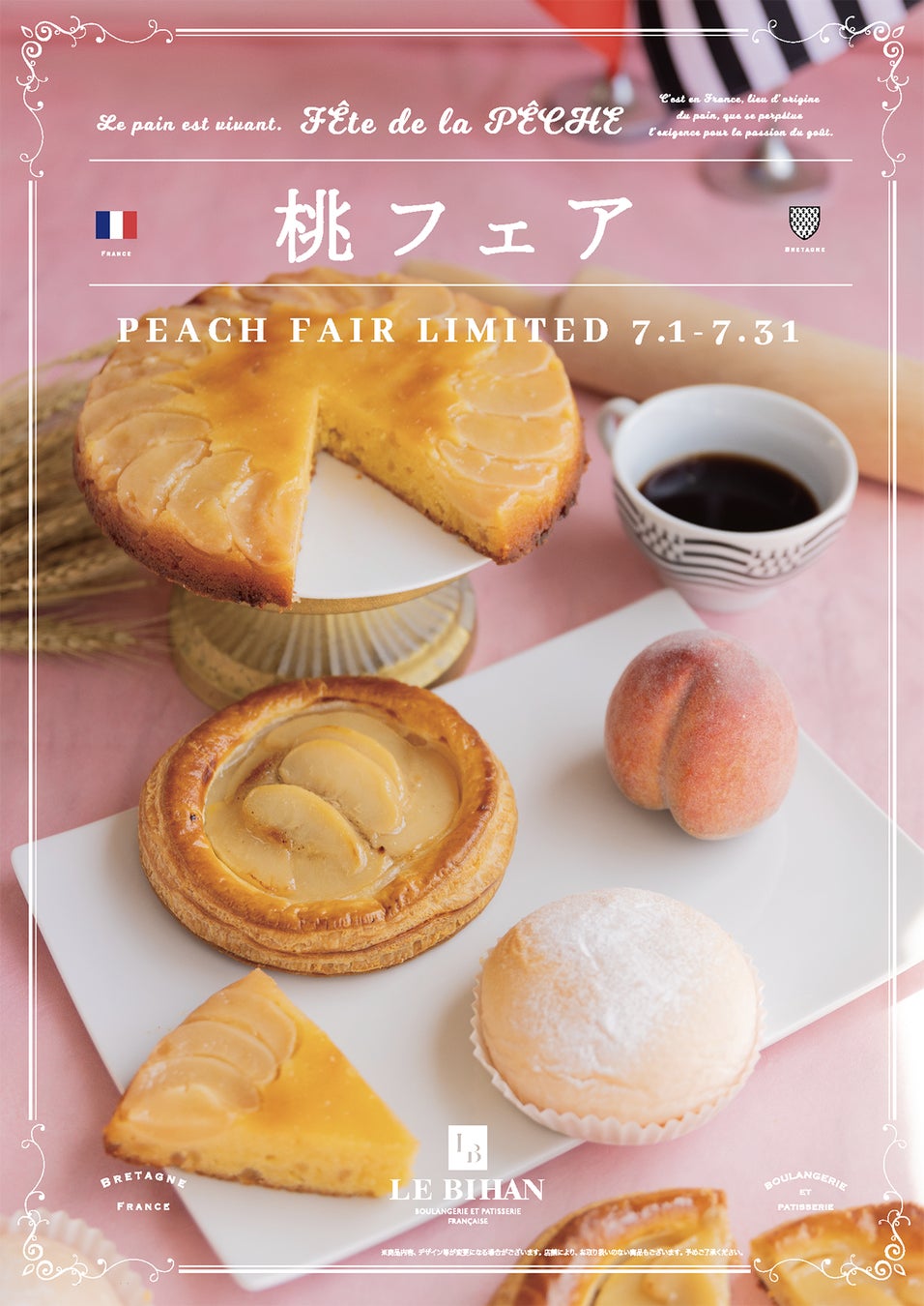 山形県産の白桃を敷き詰めた「ガトーナンテ・ペッシュ」をはじめ、白桃の果肉を合わせたまろやかなカスタードクリームを、ふんわりとした食感の生地にとじ込めた「桃のクリームパン」など期間限定の味わいを多数ご用意しております。
