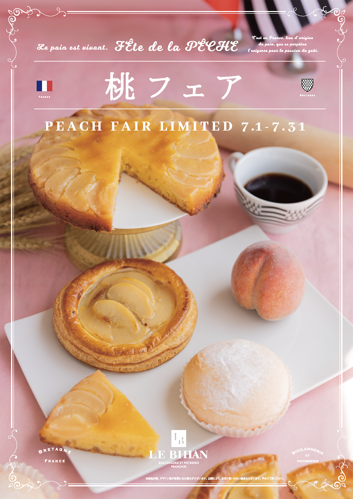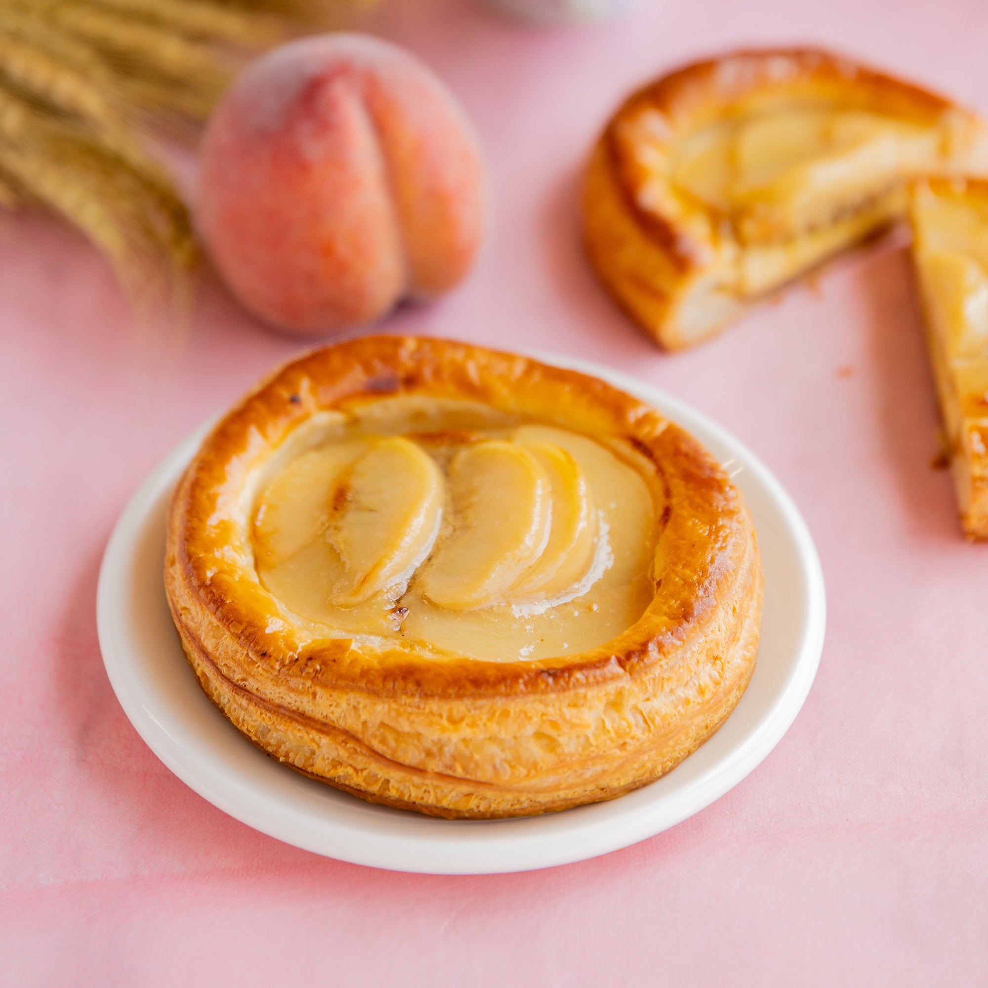 山形県産の白桃を敷き詰めた「ガトーナンテ・ペッシュ」をはじめ、白桃の果肉を合わせたまろやかなカスタードクリームを、ふんわりとした食感の生地にとじ込めた「桃のクリームパン」など期間限定の味わいを多数ご用意しております。