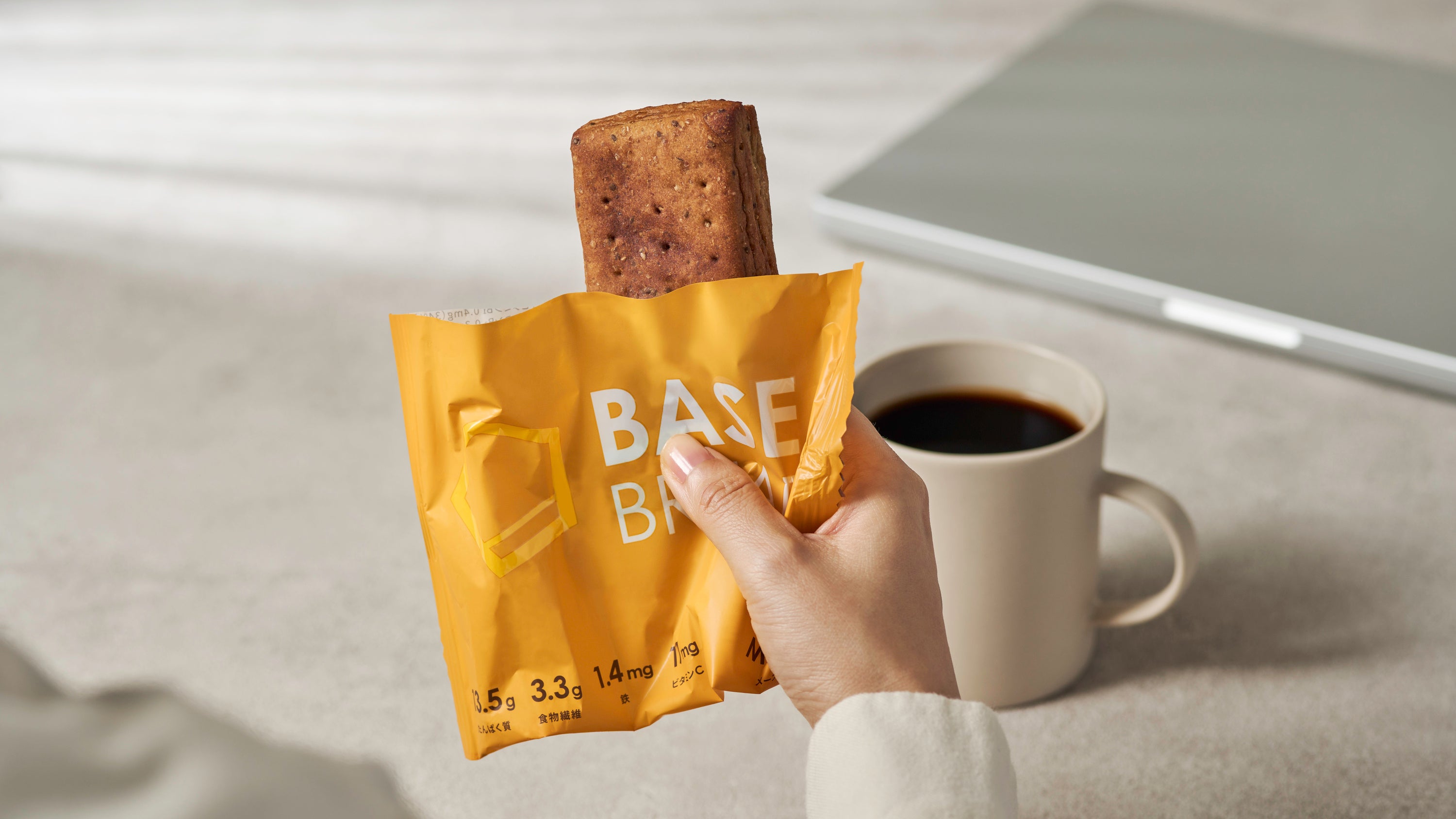 「BASE BREAD」は、1食で1日に必要な栄養素の1/3がバランスよくとれる世界初の完全栄養の主食です。全粒粉や大豆、チアシードなど厳選した10種類以上の原材料を使用しながら、栄養バランスとおいしさを独自のテクノロジーによる配合と製法で実現しました。
