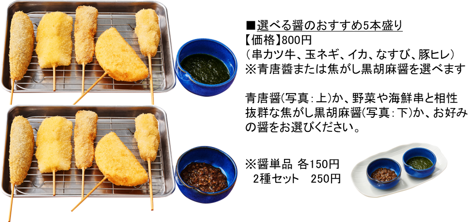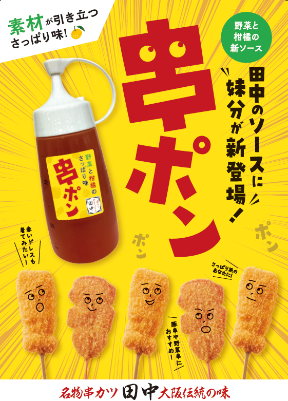 さらに、株式会社Mizkan(本社:愛知県半田市、代表取締役社長兼 CEO :吉永 智征、以下ミツカン)と共同開発した野菜と柑橘の新ソース「串ポン」の提供を開始します。爽やかでさっぱりとした味わいの串ポンは、串カツにはもちろんお通しのキャベツとも相性が良いので、是非お好みに合わせてお楽しみください。