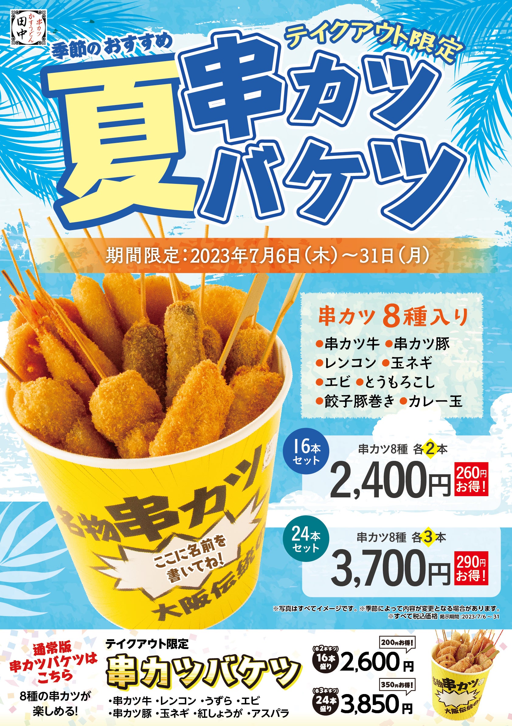 夏に食べたい「串カツ牛・串カツ豚・レンコン・玉ネギ・エビ・とうもとこし・餃子豚巻き・カレー玉」といった8種類の串カツが入った、この時期限定のお得な串カツバケツです。