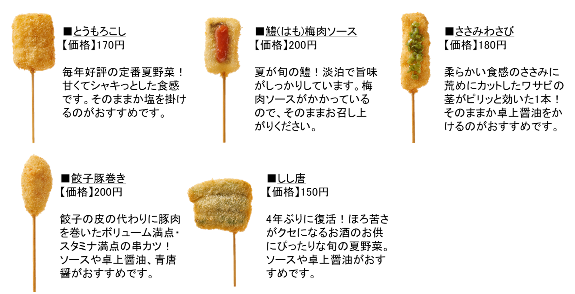 串カツ田中は、お客様が思わずお酒がすすむ新メニューで皆様をおもてなしします。メニューは全部で11種類!旬の食材を使った串カツや一品は、夏にぴったりなメニューに仕上がりました。ぜひ、串カツ田中にご来店いただき、夏の飲み会をお楽しみください。