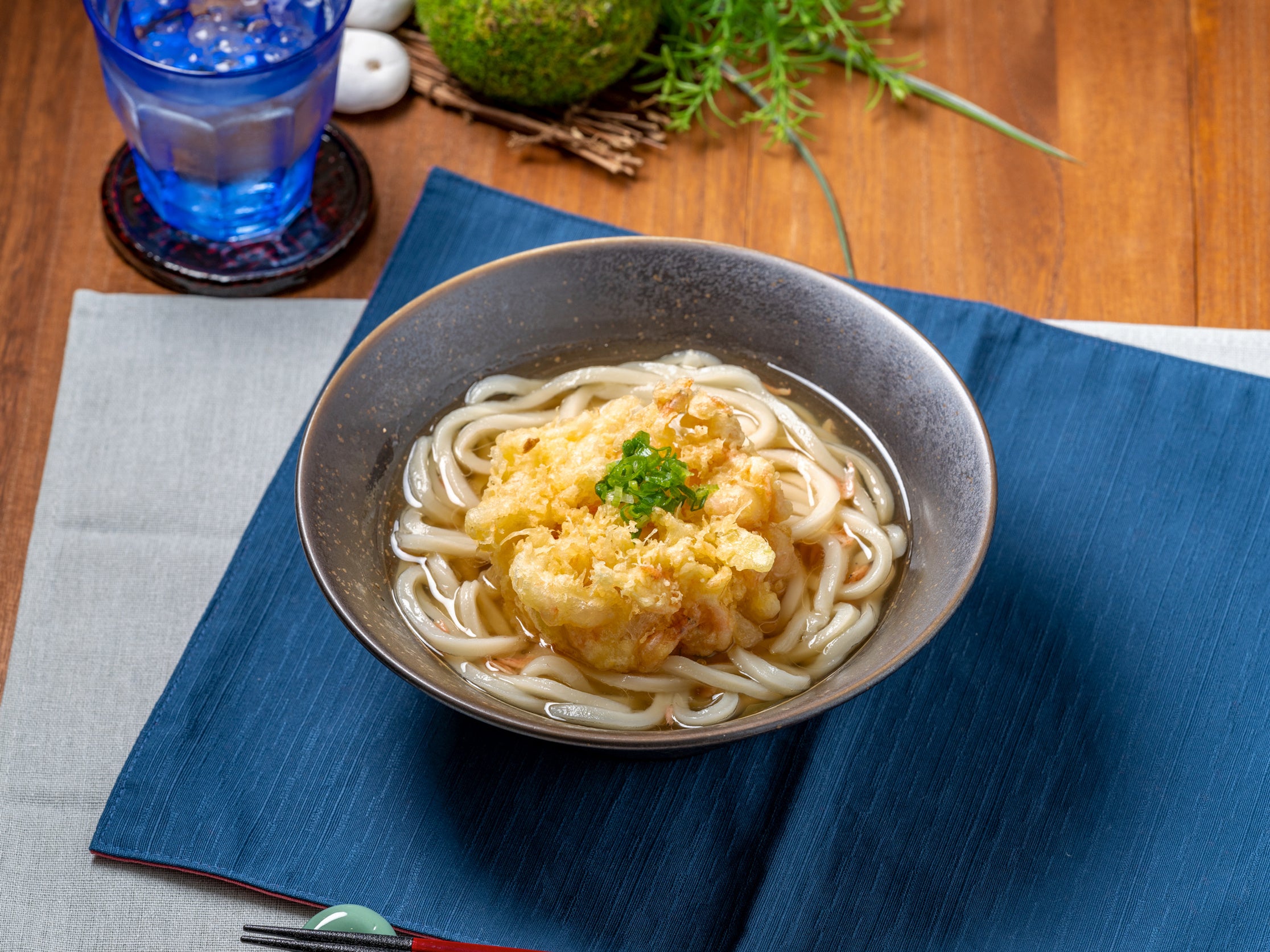 商品概要:定番の「鶏天ぶっかけうどん」に浜名湖産の青海苔と