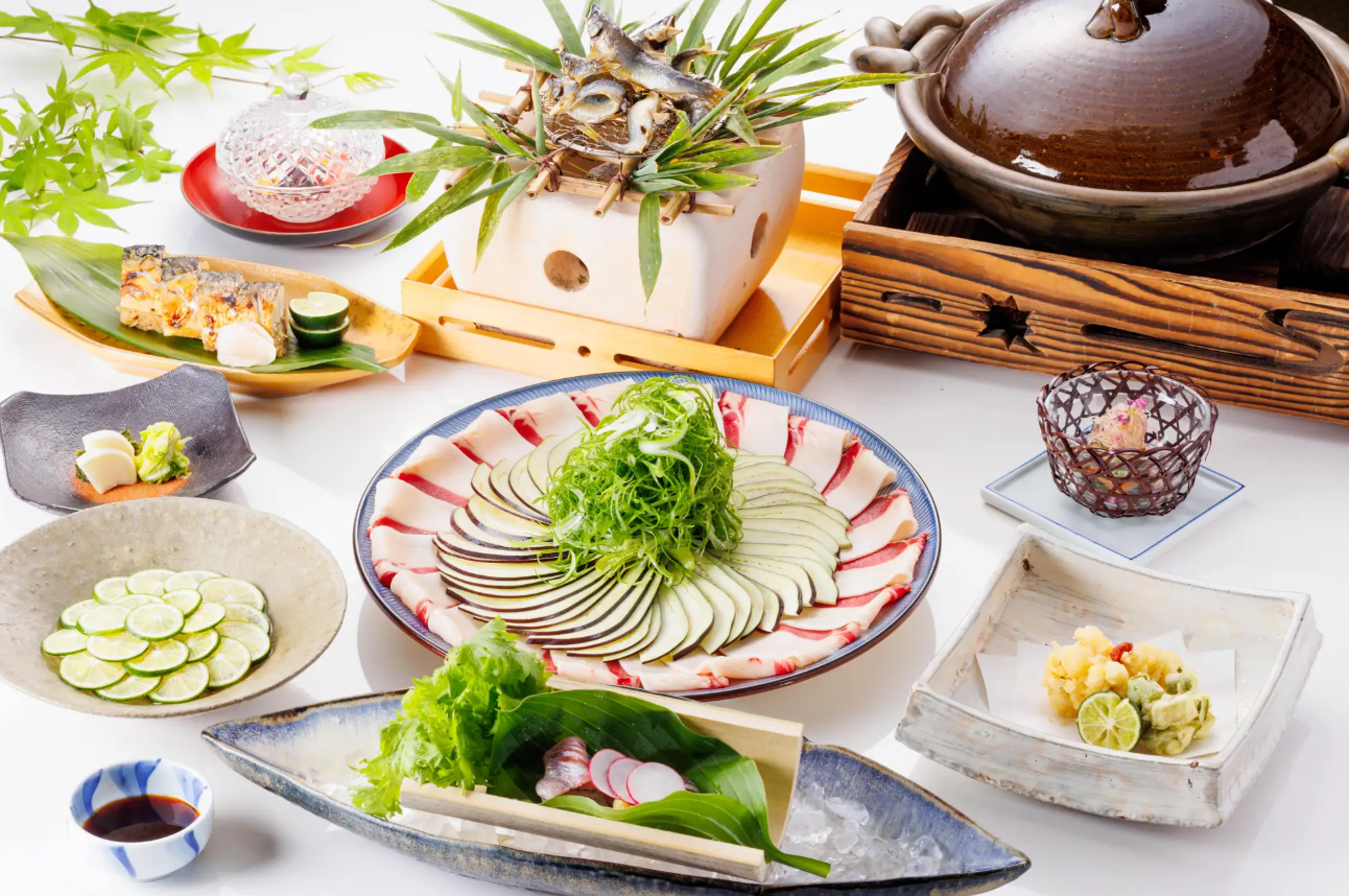 ぼたん鍋発祥の宿である料理旅館近又が夏にもぼたん鍋をお楽しみいただきたいとの想いから完成したさっぱりした味に仕上げた夏のぼたん鍋や、今や世界中で取り組まれているSDGsの一環として「地産地消」「地元食材」「地元生産者」「余った野菜や肉は出汁に使用」「出汁に使った後の食材は地元農家に肥料として提供」など持続可能な食文化の継承をテーマにした地球に優しいサステナブル会席。