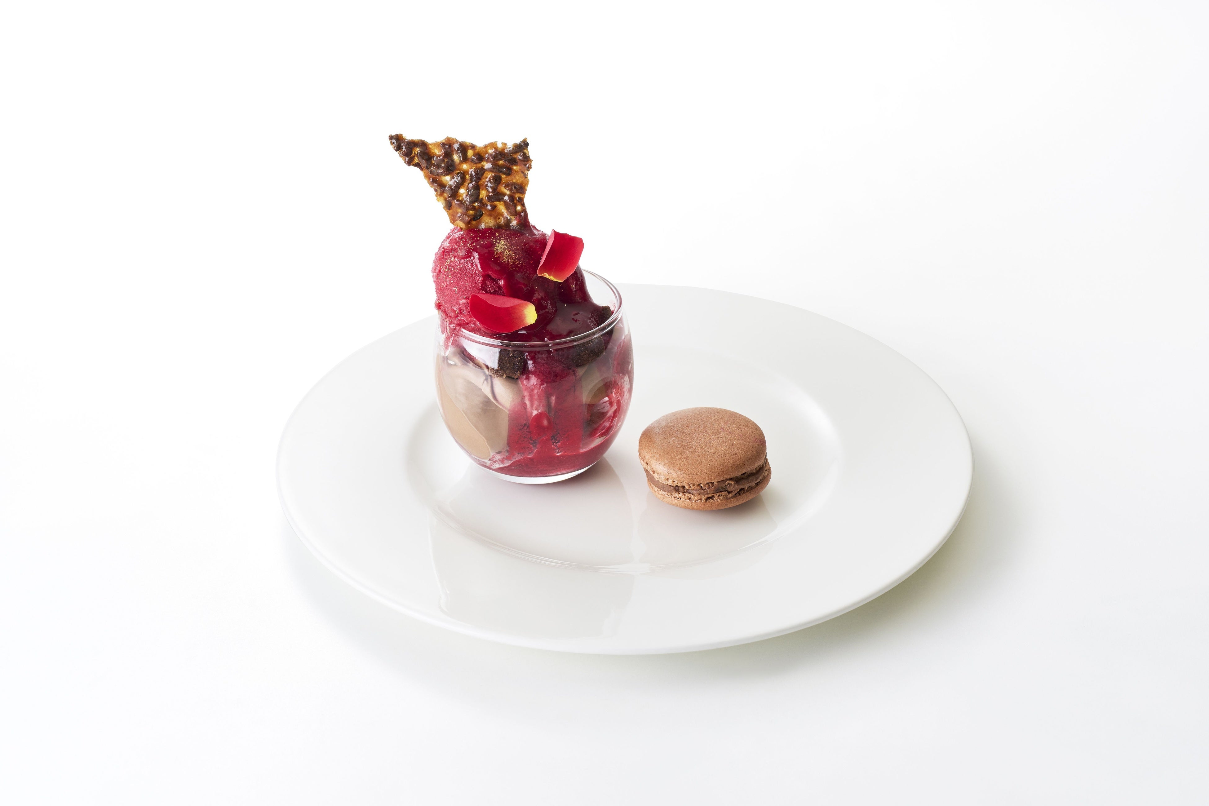 フランボワーズのソルベにチョコレートクランブルやクリーム、フランボワーズソースを合わせ、カカオニブのチュイルとローズペタルを飾った、見た目にも華やかなミニサイズのパフェとおすすめのマカロン1個のセットプレート。甘酸っぱいフランボワーズソルベに、とろりと濃厚なチョコレートクリームとサクサクのクランブルとのマリアージュを、チュイルの食感のアクセントと共にお楽しみいただけます。