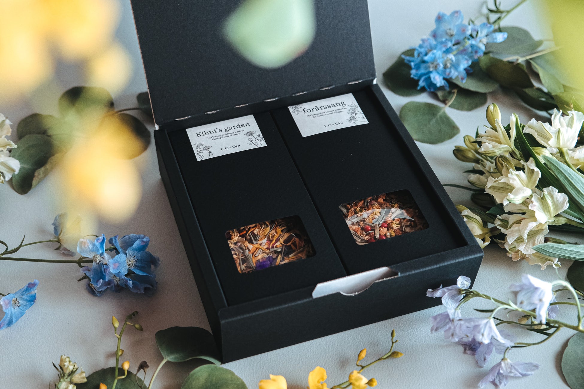 「ティーギフトセット -flowery-」は、E CA QUIの人気商品である「Klimt’s garden」と「forårssang」を詰め合わせにした商品です。どちらも花の香りを軸にしたハーブティーで、華やかな見た目がプレゼントにぴったり。ベースには日本の薬草茶や中国茶などを取り入れ、ハーブティーが苦手な方でも親しみやすい味わいに仕上げています。