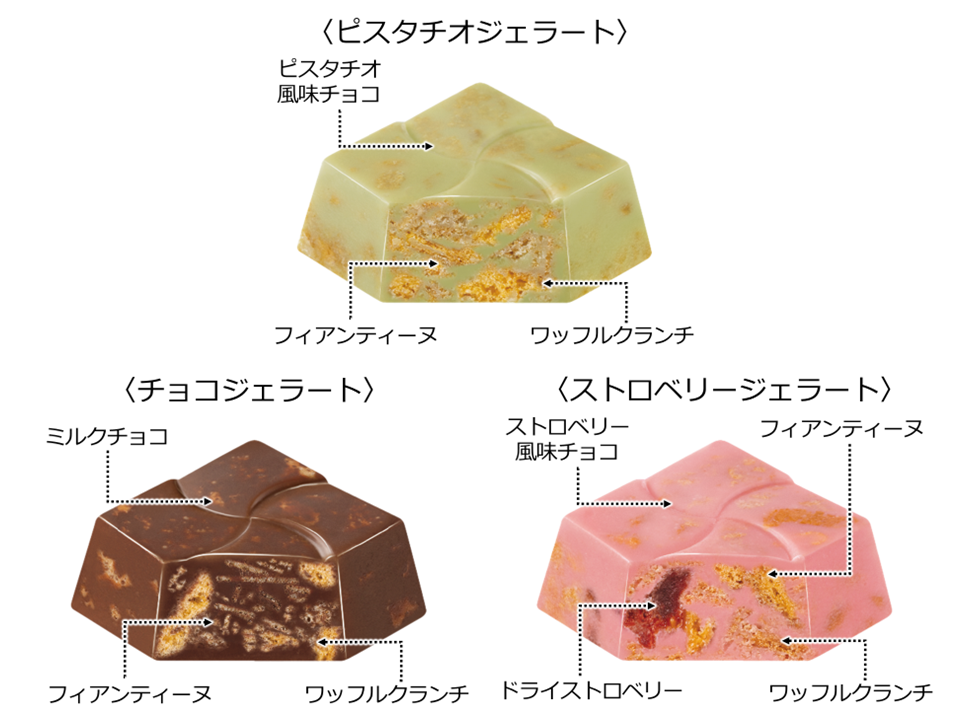 ピスタチオ・チョコ・ストロベリーの3種類のジェラートチョコを楽しめるアソート商品です。フィアンティーヌ・ワッフルクランチでコーン部分のザクザク食感を再現しました。ひんやりとした清涼感にもこだわっています。