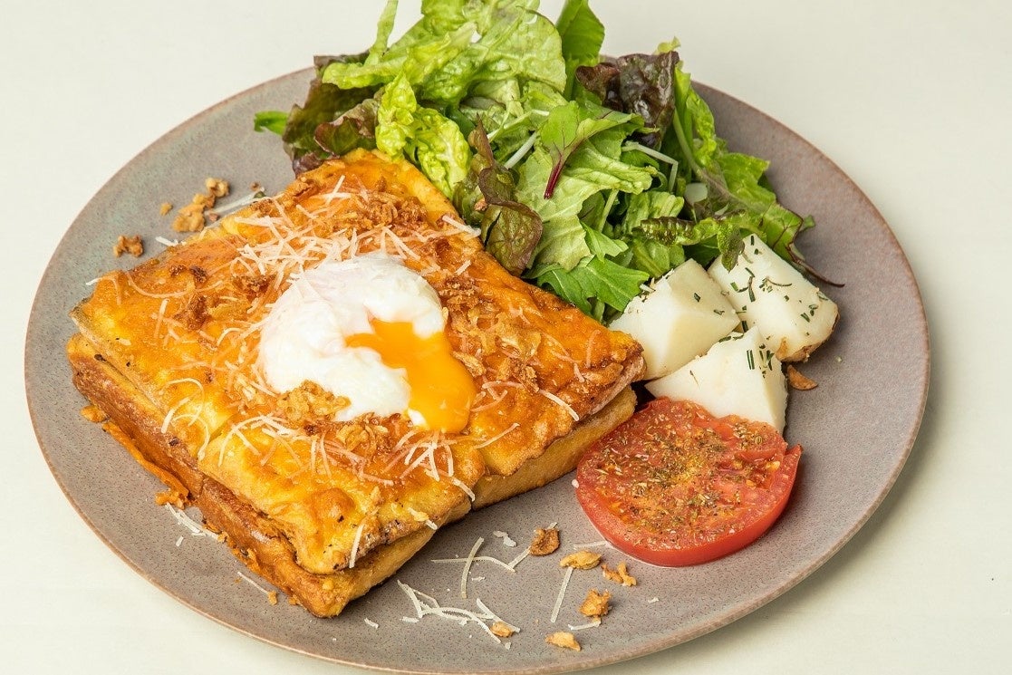 ベーコンとチェダーチーズの塩分とフレンチトーストの優しい甘みがマッチした濃厚でボリューム満点のオリジナルクロックマダム。癖になる美味しさです。