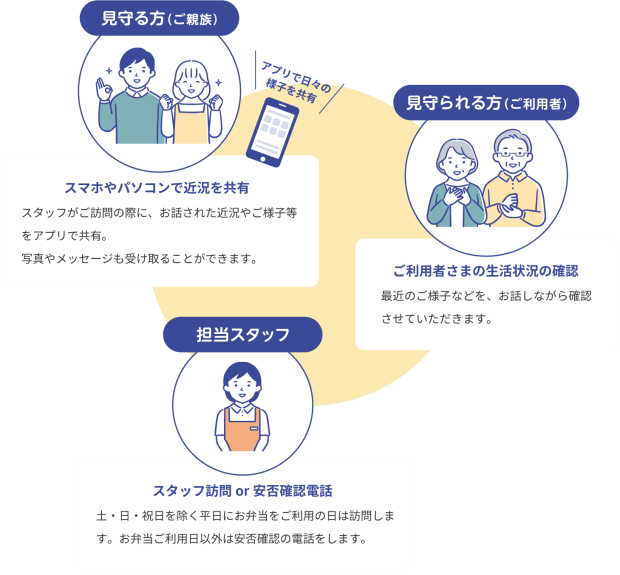 ・毎日ご利用者さまのご自宅に伺い、ご本人と直接お会いしてお話しし、体調や生活の状況などを確認いたします。(お弁当のお届けがない日はお電話にて確認いたします)