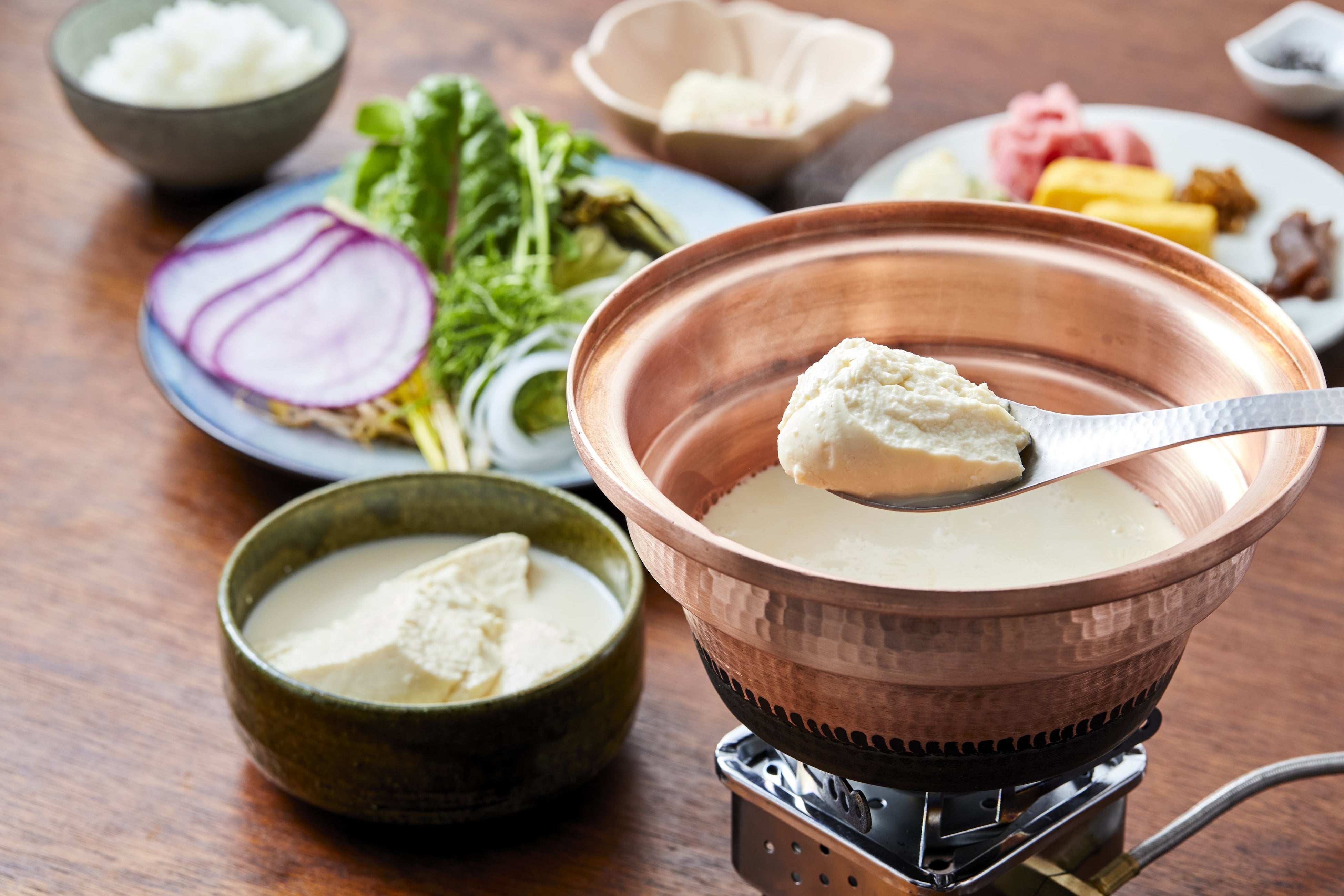 自家製の豆乳出汁におぼろ豆腐、湯葉を加えてお野菜をしゃぶしゃぶしてお召し上がりください。