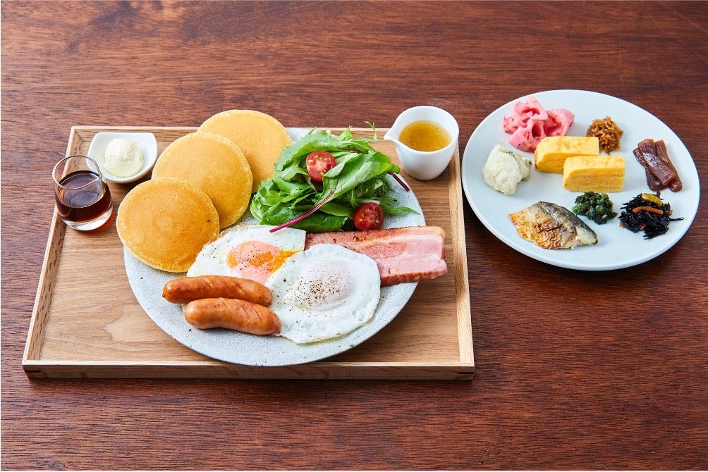 内容:目玉焼き、ベーコン、ソーセージ、パンケーキ、サラダ、お惣菜ブッフェ,ドリンク付き
