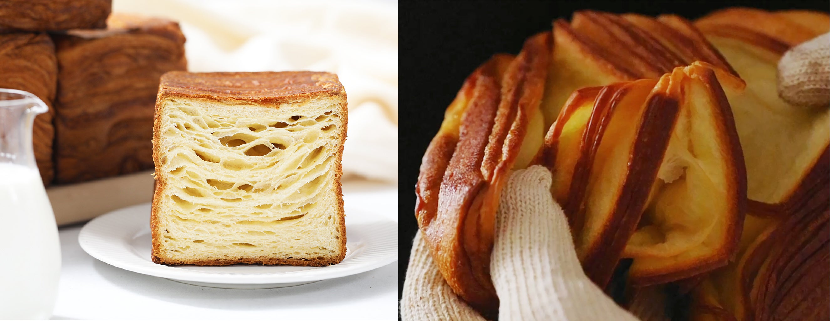 ・ミルフィーユのように48層に折り重なったこだわりのミルク風味のデニッシュ食パンで、外はサクサク、中はしっとり。ミルクのような甘味のある生地が48層にも重なることで、しっとり感が際立つ食感に仕上げました。ミルクの風味が口の中でじんわり広がる至福の味わいをご賞味ください。