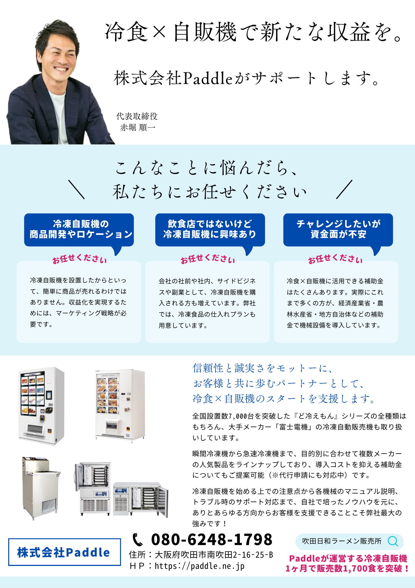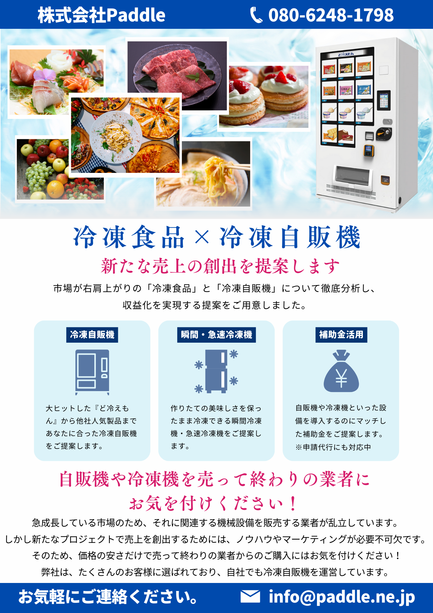 ラーメンに餃子、お肉・お魚、パスタやスイーツなど…飲料ではなく食品を取り扱った冷凍自販機が、コロナ禍のあいだに急増しました。街や駅で見かけたことある人も多いでしょう。これは背景として、自販機が非対面・非接触で営業活動できるメリットと、飲食店が時間指定営業や休業を余儀なくされたデメリットが合致したことにより、冷凍自販機が増えていったわけです。しかしコロナが落ち着いた今、この自販機がシンプルにビジネスとして注目を集めています。むしろ乗り遅れた飲食店さんの方が、より有利な形でスタートアップできるチャンスです!!