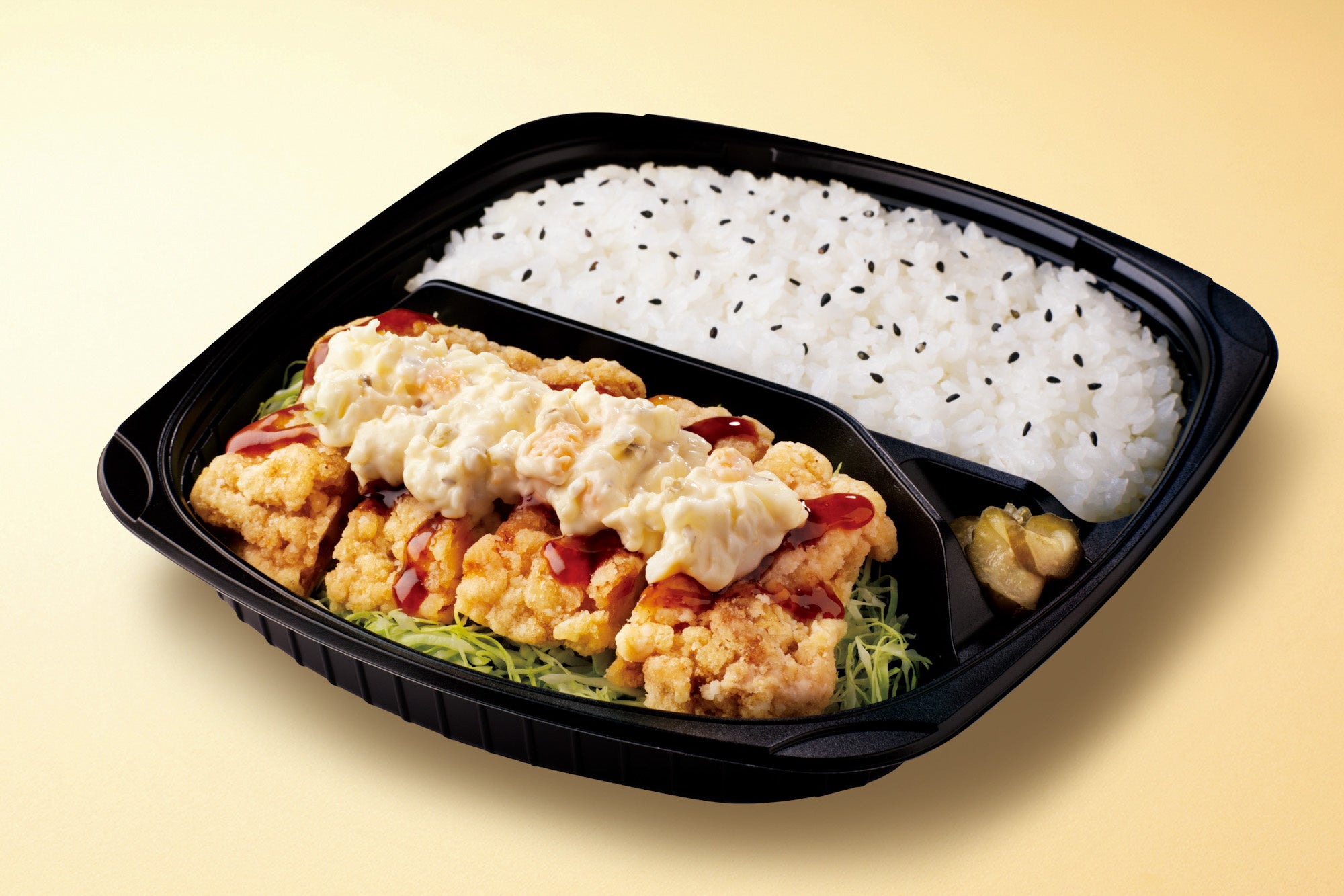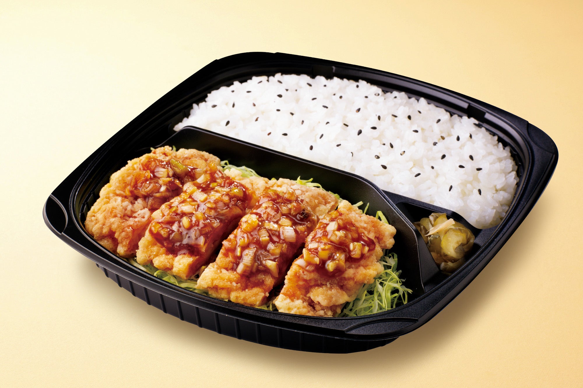 ※売り場に並んでいる、すぐにお持ち帰りできる「香味野菜だれの油淋鶏弁当」「たっぷりタルタルチキン南蛮弁当」「牛焼肉弁当」は、キャベツの千切りの代わりにパスタを使用しています。