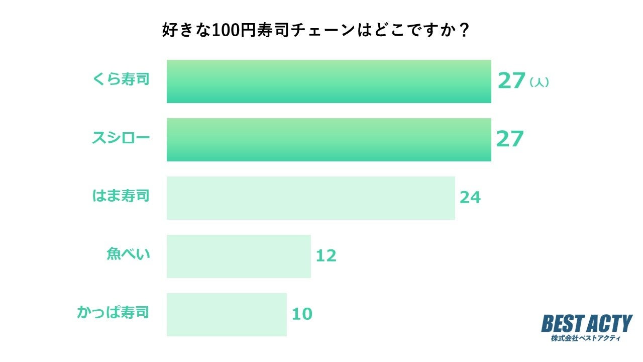 好きな100円寿司チェーンについて100名にアンケートを行ったところ、「くら寿司」と「スシロー」が同率1位となりました。