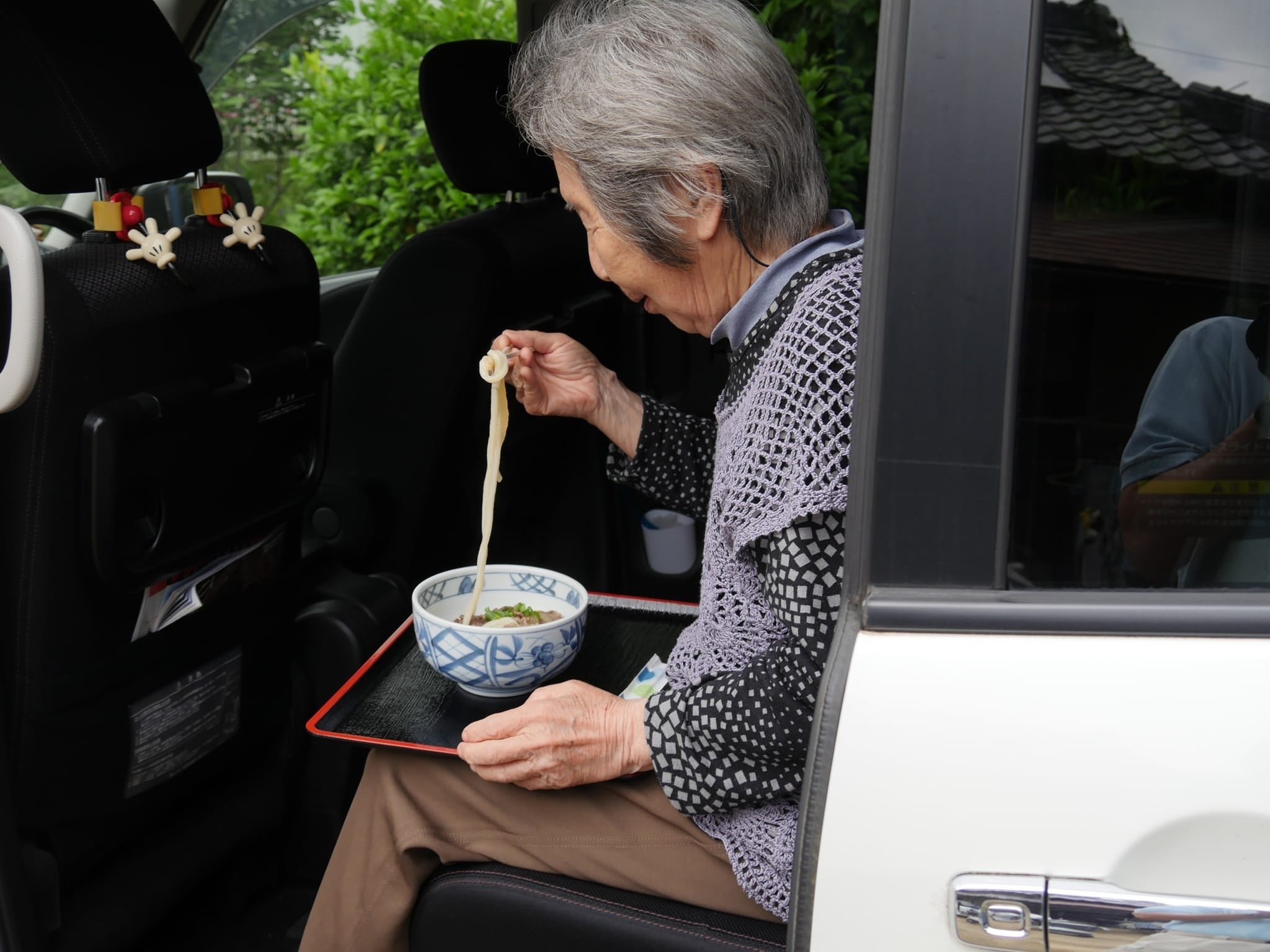 しかし、出来立てのうどんはとても熱々で、丼をお盆にのせて運ぶしかないのですが、かなり不安定。ましてや、テーブルがない車中、おばあちゃんが膝の上に載せたお盆から食べる熱々のうどんは、火傷の危険性すらありました。