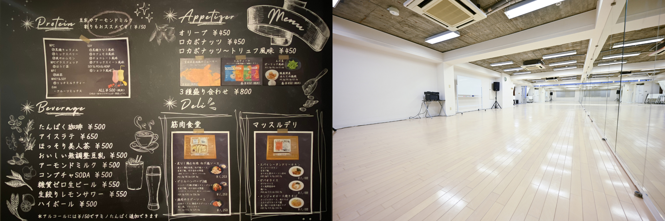 フードメニューは、手軽なヘルシーデリとして人気を集める「マッスルデリ」と「筋肉食堂」のお弁当をイートイン・テイクアウトともにお召し上がりいただけます。通常はまとめ買いや定期購入が基本となっている宅食サービスを気軽にお試しいただける、都内で唯一の施設となっています。