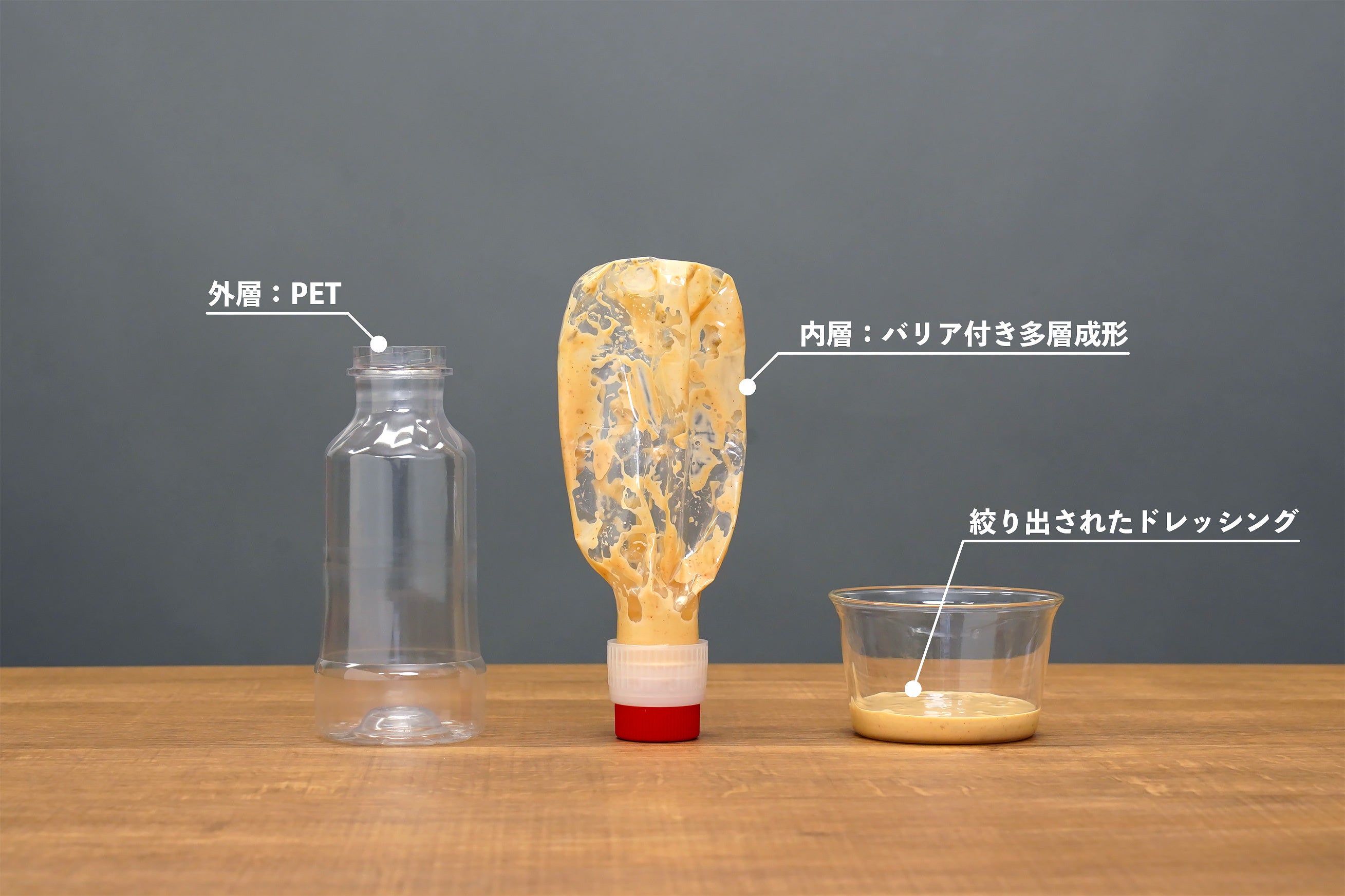 内層は多層構造になっており、従来のPET容器比で2倍の酸素バリア性を備えております。内容物の賞味期限延長も期待でき、フードロス対策となります。さらに、バリア性を内層に付与したことにより、PET外層を薄くすることも可能となりました。一般的なドレッシング向けPETボトルと比較して、10%前後の重量削減(=減プラ)も実現可能です。