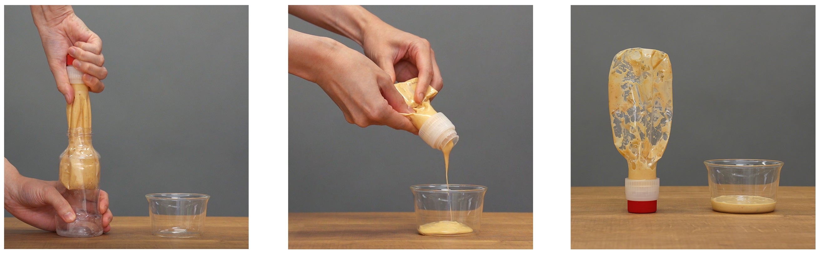 一方で、ドレッシングのような粘度の高い内容物の場合、すべて使い切ることが困難でした。7%(当社調べ)ほどが容器内に残ったまま廃棄されることとなり、フードロスの観点からも課題がありました。