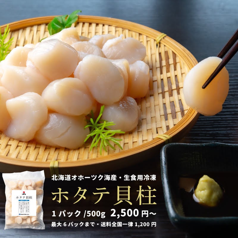 寒流の中で育った、身の締りがいいホタテの貝柱。個々に凍結可能な冷凍技術を使用しているので、必要な量だけを取り出しやすい商品です。
