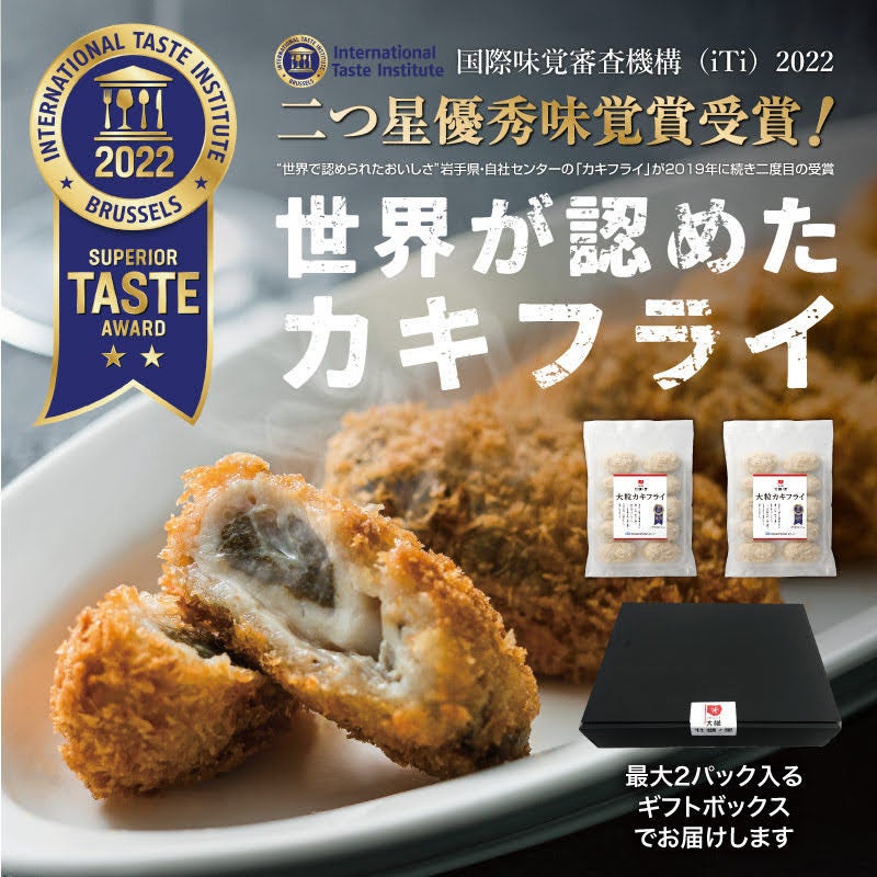 国際味覚審査機構( International Taste Institute、略 ITI)が開催する「優秀味覚賞」で、2019年に日本初の2つ星を受賞し、2022年にも2回目の2つ星を受賞した『究極の大粒カキフライ』。揚げていただくと、熱々の牡蠣から香る潮の香りとジューシーな味わい、サクッとした薄衣を一 緒にお楽しみいただけます。