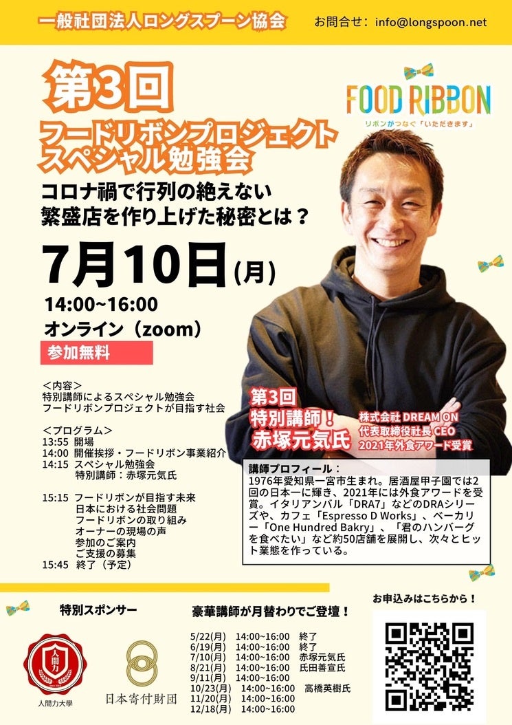 「すべての子ども達がいつでも安心して食事ができる世の中」へと、全国の飲食店が場となって実施されている子ども食事支援活動「フードリボンプロジェクト(運営団体:一般社団法人ロングスプーン協会)」が、月に一度、外食産業の著名人を講師に招聘するオンライン勉強会を実施しています。