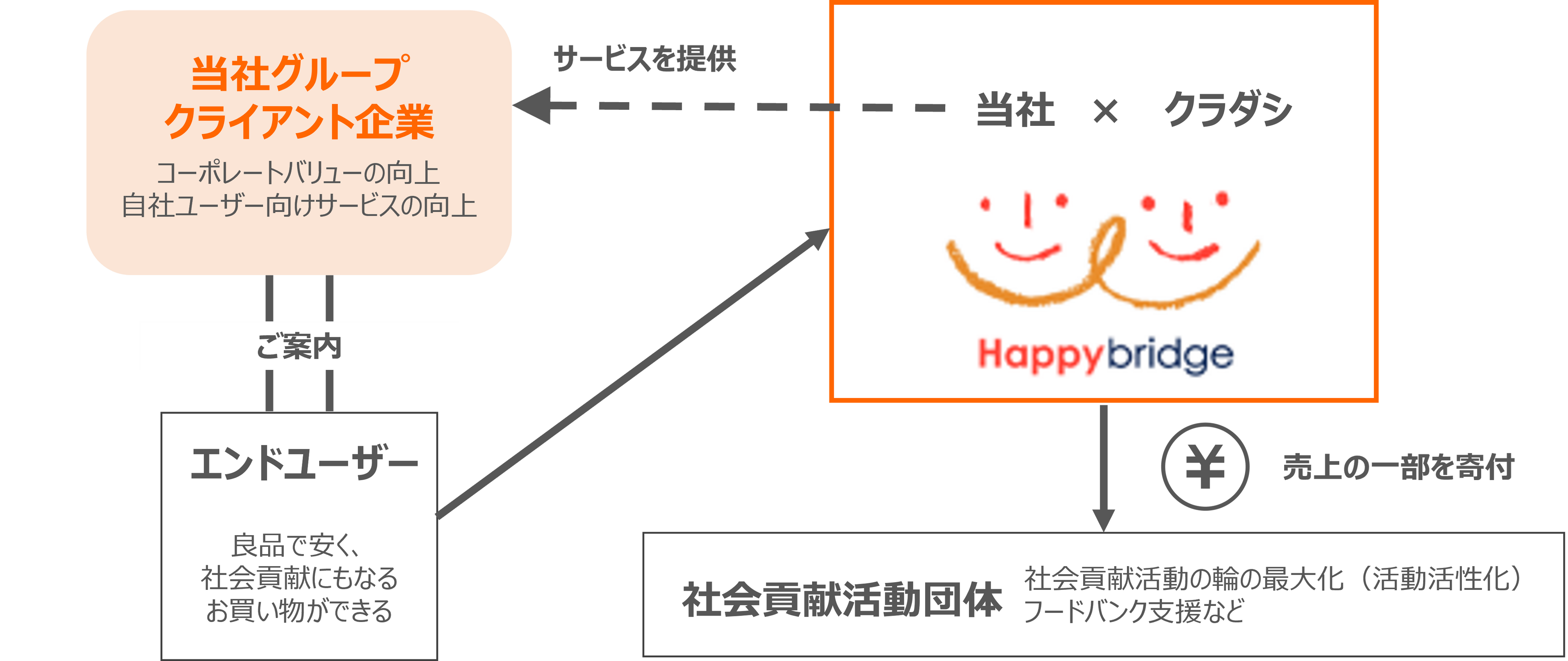 「Happy bridge」は、当社グループのクライアント企業のエンドユーザーが利用する会員サイト経由で集客を行い、賞味期限が間近な食品や規格外で販売されなかった商品に価値を見出し、フードロス削減を目指す社会貢献型ショッピングサイトです。クラダシが提供する「Kuradashi」サイトと同様に利用者のお買い上げ金額の一部が社会貢献活動の支援に充てられます。新たな顧客接点を創出すると同時に、各個人や家庭単位でSDGsの達成に貢献することができます。