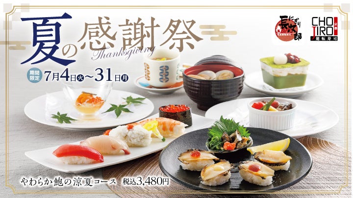 やわらか鮑の涼夏コースのおすすめポイント ①お客様のお食事のペースに合わせて、7品をご提供。 回転寿司では珍しいコース料理。前菜2品、メインのお寿司2皿、椀物2品、デザート1品の合計7品! ②メインは長次郎の新しい味!煮あわび丸ごと1個にぎり。 煮あわびは長次郎の商品開発担当者が味付けや炊きあがりの柔らかさにこだわって5ヶ月かけて作り上げたこの夏イチオシで食べていただきたい商品です。 |