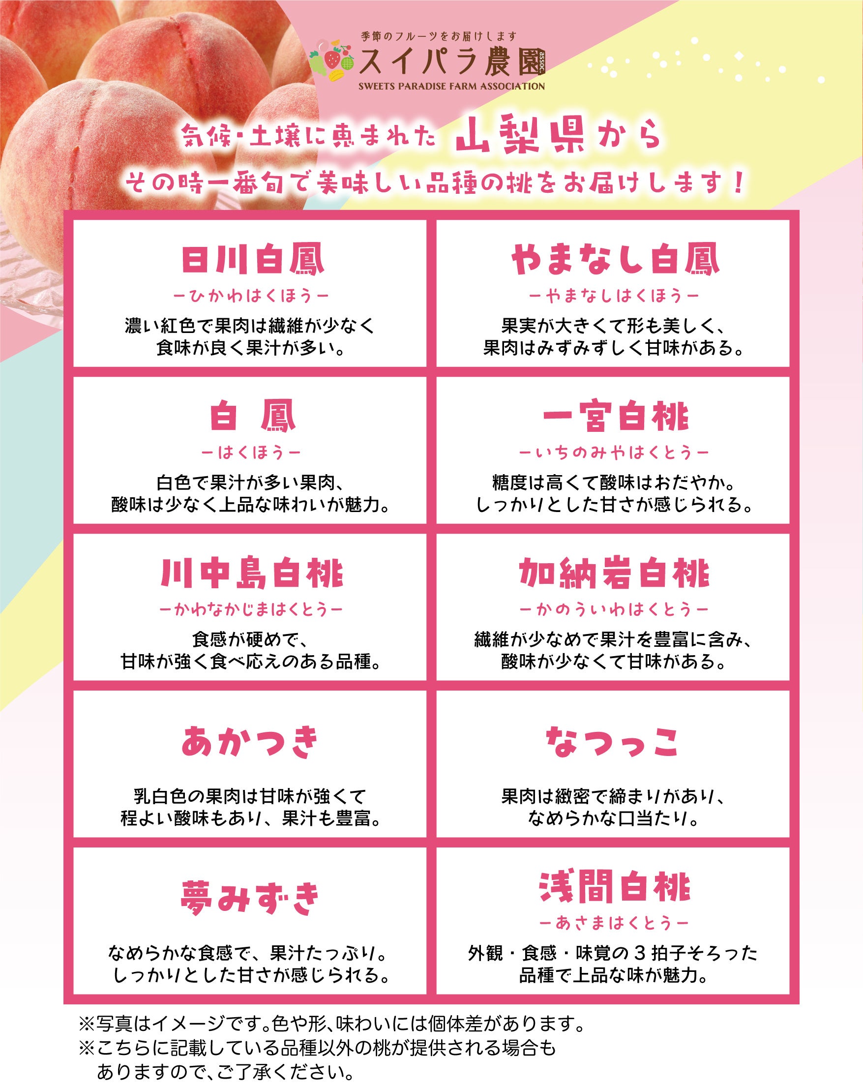 ※天候・入荷状況等の影響で掲載している品種以外の桃をご提供する場合もございます。予め、ご了承ください。
