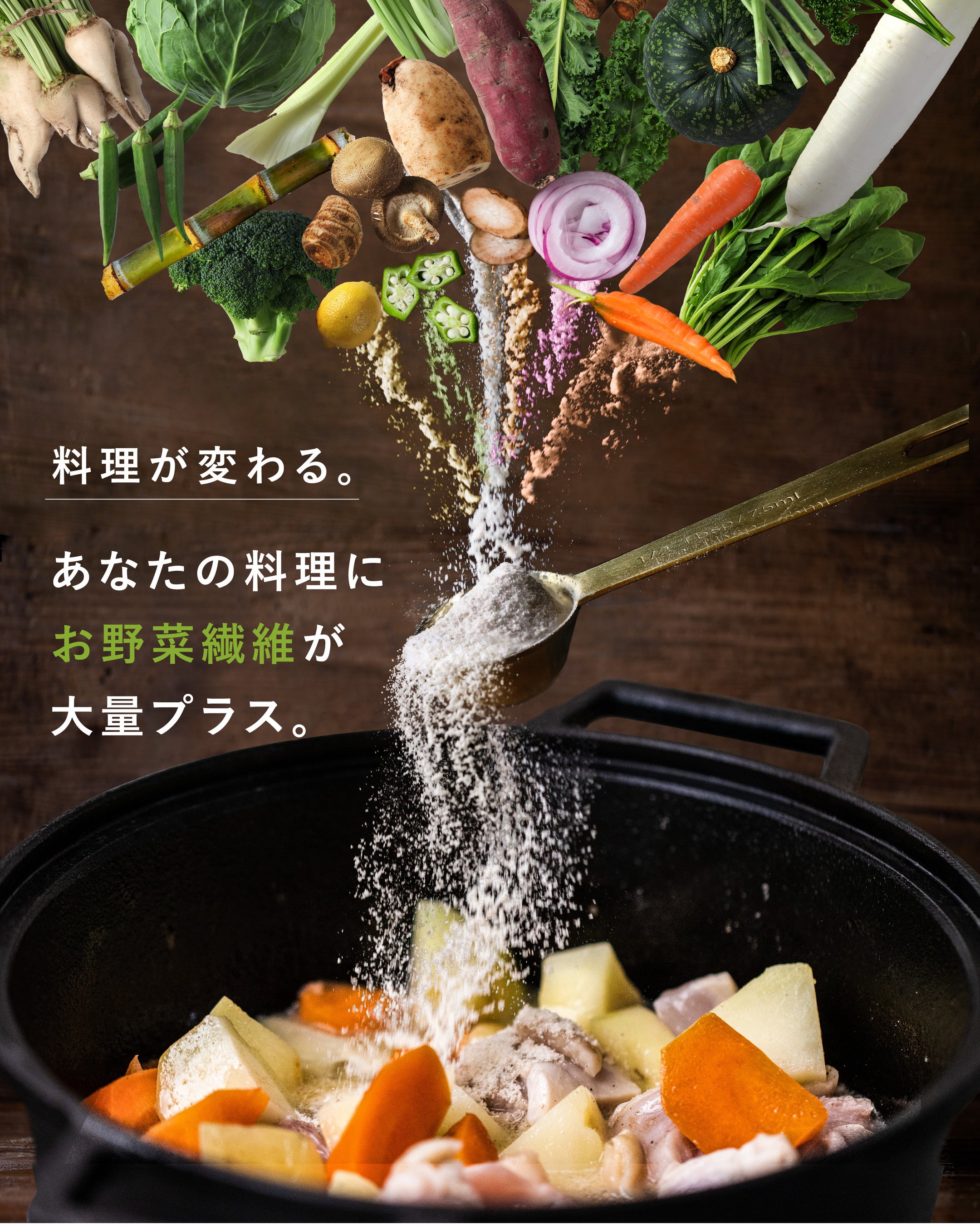 26種類の「野菜・植物」にこだわった、繊維たっぷりの「プレミアムな甘み粉」です。毎日の料理に使うことで、家族の健康を守る「健康料理」に早変わりします。