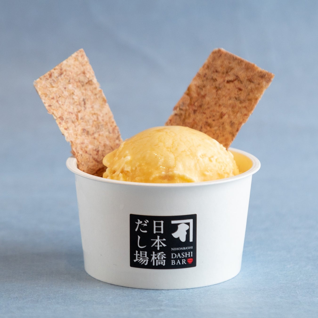 近海限定本枯鰹節、和三盆糖、下総醤油、沖縄の海水塩、北海道産昆布など、こだわりの素材を使用した最上位品のつゆの素 伊勢屋伊兵衛。アイスクリームにかけることで、うま味の濃い、つゆの美味しさを感じていただけます。つゆと相性のよい、ほどよい硬さのアイス選びにもこだわりました。トッピングの手巻きかつおと一緒に、「鰹節×アイスクリーム」の味わいをお楽しみください。