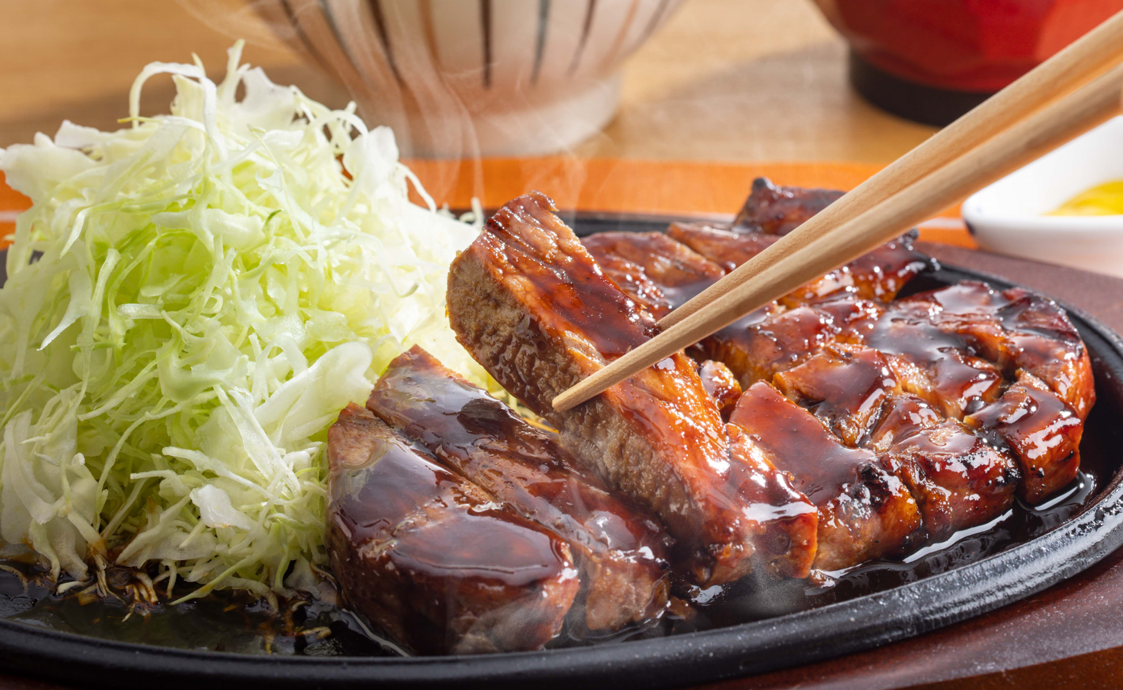 やわらかな食感で肉の旨みがしっかり感じられるよう、店内で3時間以上漬け込み、炭火でじっくり火を入れました。味噌で甘味とコクをプラスしたトンテキソースはニンニクを効かせ、ジューシーな厚切り肉と相性抜群です。鮮度にこだわり、毎朝店内で仕込んでいるキャベツは驚くほどのシャキシャキ食感。さらに、鉄板で提供することで熱々のままご賞味いただけ、香りと共に食欲がそそられる定食屋らしい“大戸屋の新名物”です。
