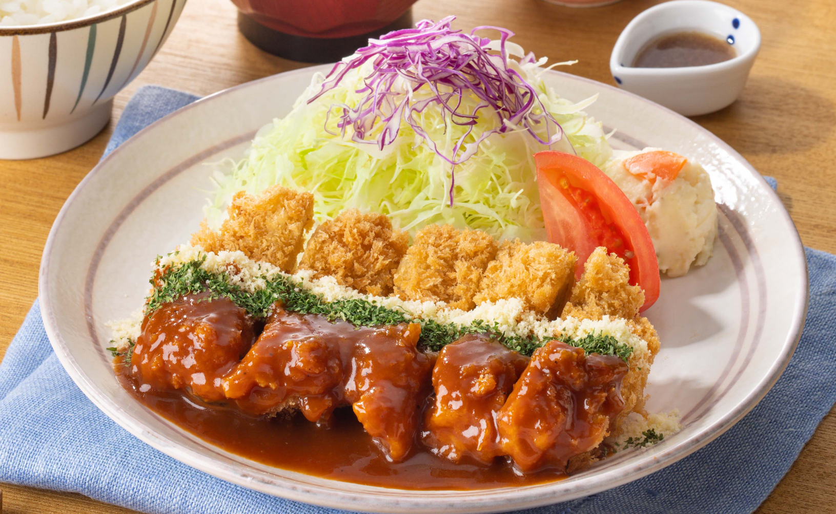 サクッと揚げたチキンかつ、和風のデミグラスソースと粉チーズの相性はバツグン。こだわりの和風デミグラスソースは、ローストオニオンや、煮込んだ野菜の旨味をブレンドし、豆味噌とバターを加え、コクと旨味の強いご飯が進む和風テイストに仕上げました。