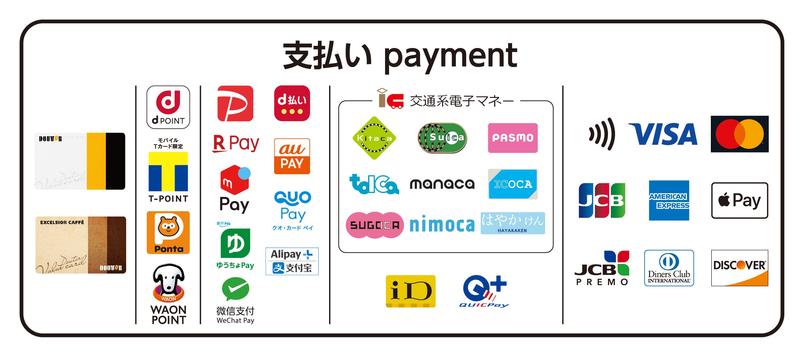 また、お客様の利便性とサービス向上のため、ドトールグループ店舗ではキャッシュレス決済を推進しており、ハウスプリペイドカードの「ドトール バリューカード」「DVCアプリ」をはじめ、各種コード決済、Suica等の交通系電子マネー、クレジットカード、非接触型電子マネー等の決済方法にも幅広く対応しています。
