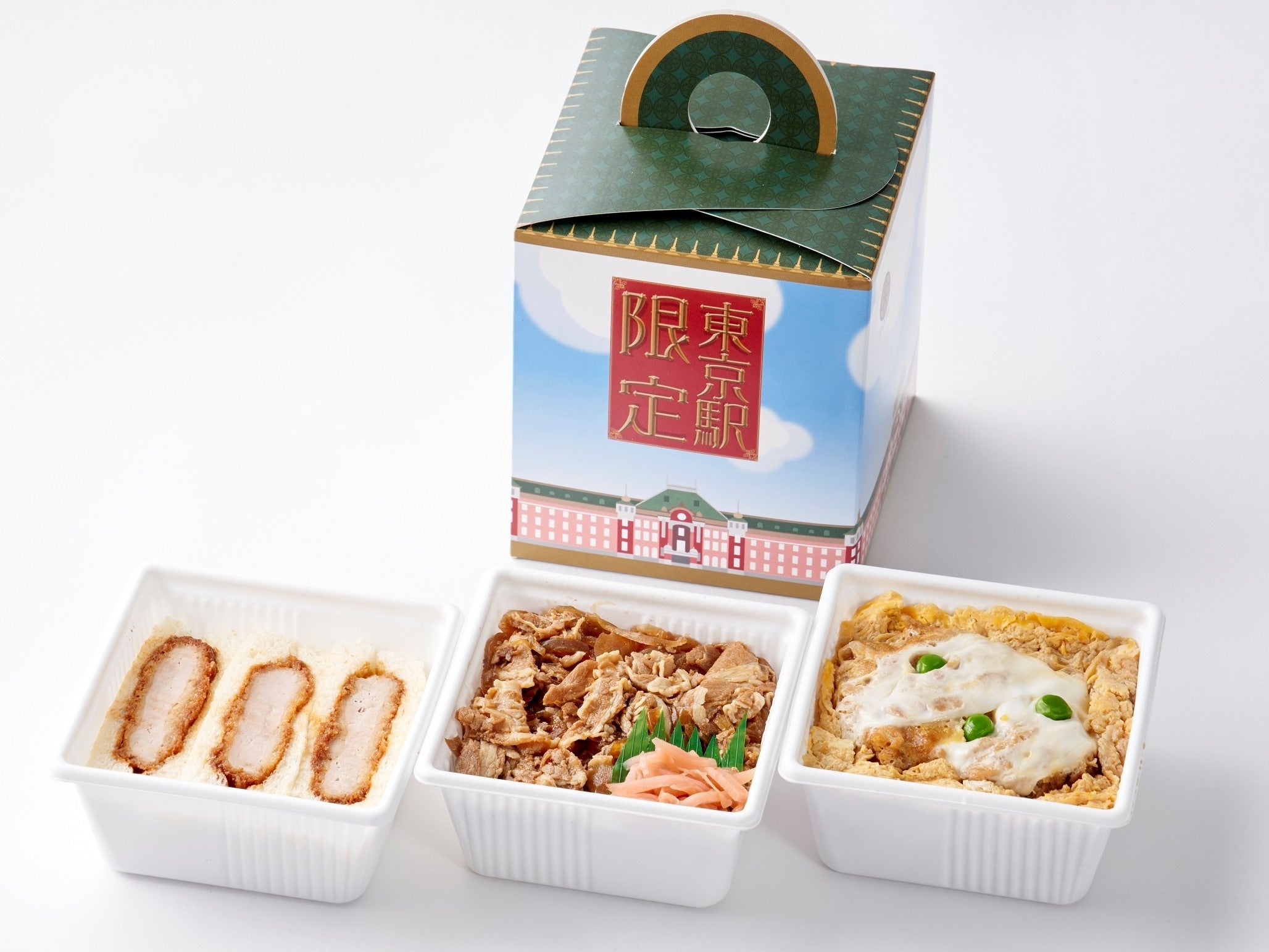 看板商品ヒレかつサンドにタレが効いたかつ丼、豚すき丼と、コンパクトで食べやすいです。パッケージはハレやかな旅になるようイメージしています。