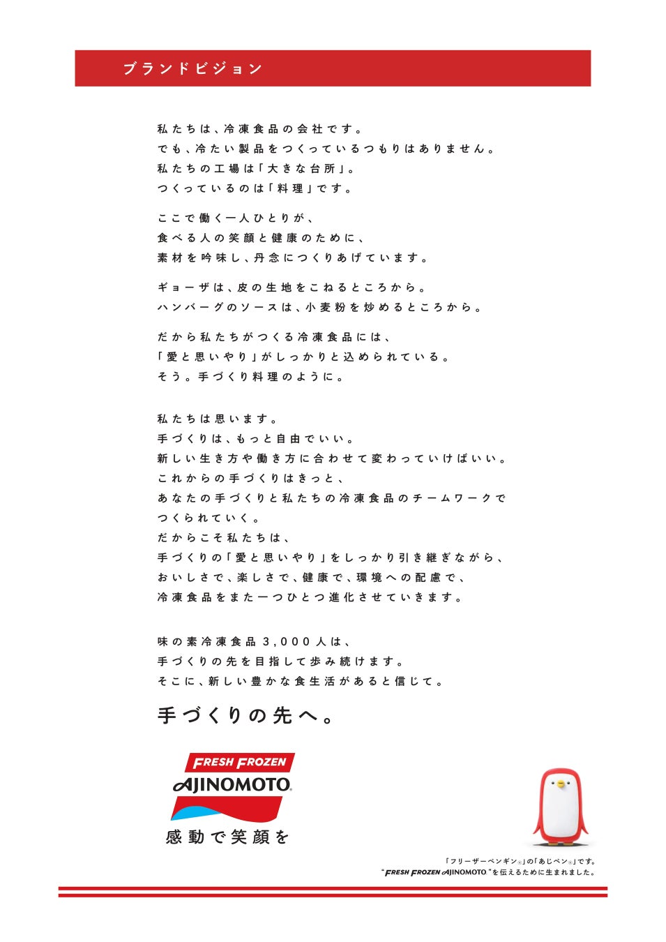 新カンパニースローガンのもと、“おいしい”と言われるまでになった冷凍食品の常識を変えるべく、「第二の創業期」という新たなチャレンジ精神を掲げ、とびきりのおいしさ、ワクワクする楽しさ、からだ想いのやさしさ、地球環境への思いやりで、冷凍食品をまた一つ進化させていくという強い想いを、新ブランドビジョン「手づくりの先へ。」に込めました。