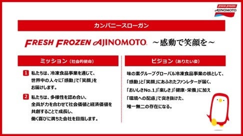当社は、味の素グループグローバル冷凍食品事業の核として、「感動」と「笑顔」にあふれたファンレターが届く、「おいしさ No.1」「楽しさ」「健康・栄養」に加え、「環境への配慮」で突き抜けた唯一無二の存在になることをビジョン(ありたい姿)として新たに設定しました。このビジョンを、共に働くすべての仲間が心に刻む合言葉とすべく、「FRESH FROZEN AJINOMOTO® ~感動で笑顔を~」をカンパニースローガンとして新たに策定しました。
