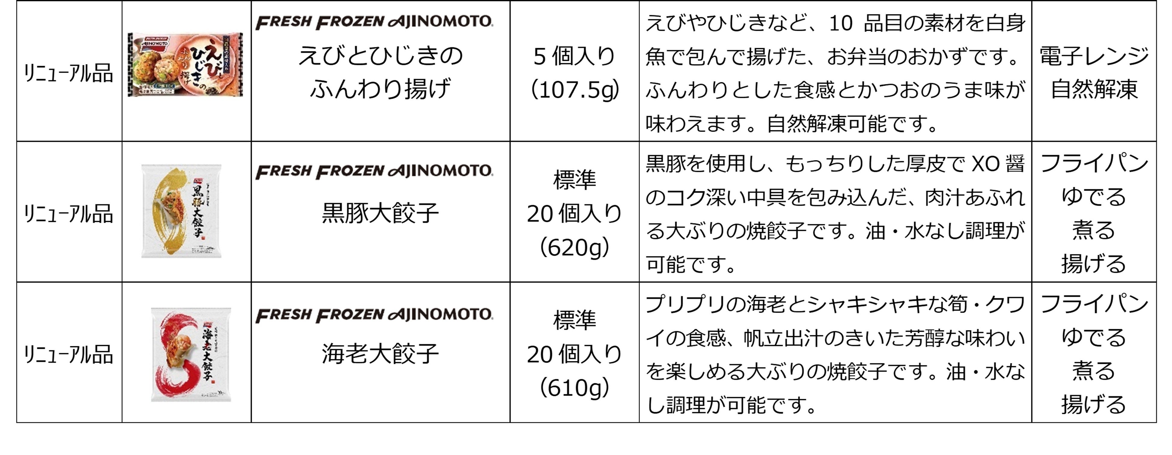 また、電子レンジで約3分調理するだけで、香ばしい焼き目がついた餃子が味わえる「レンジでギョーザ」は、香味野菜の風味やジューシーさ、食べ応えをより感じられるように、中具がさらにおいしくなり、具の量も1個当たり2g増量しました。