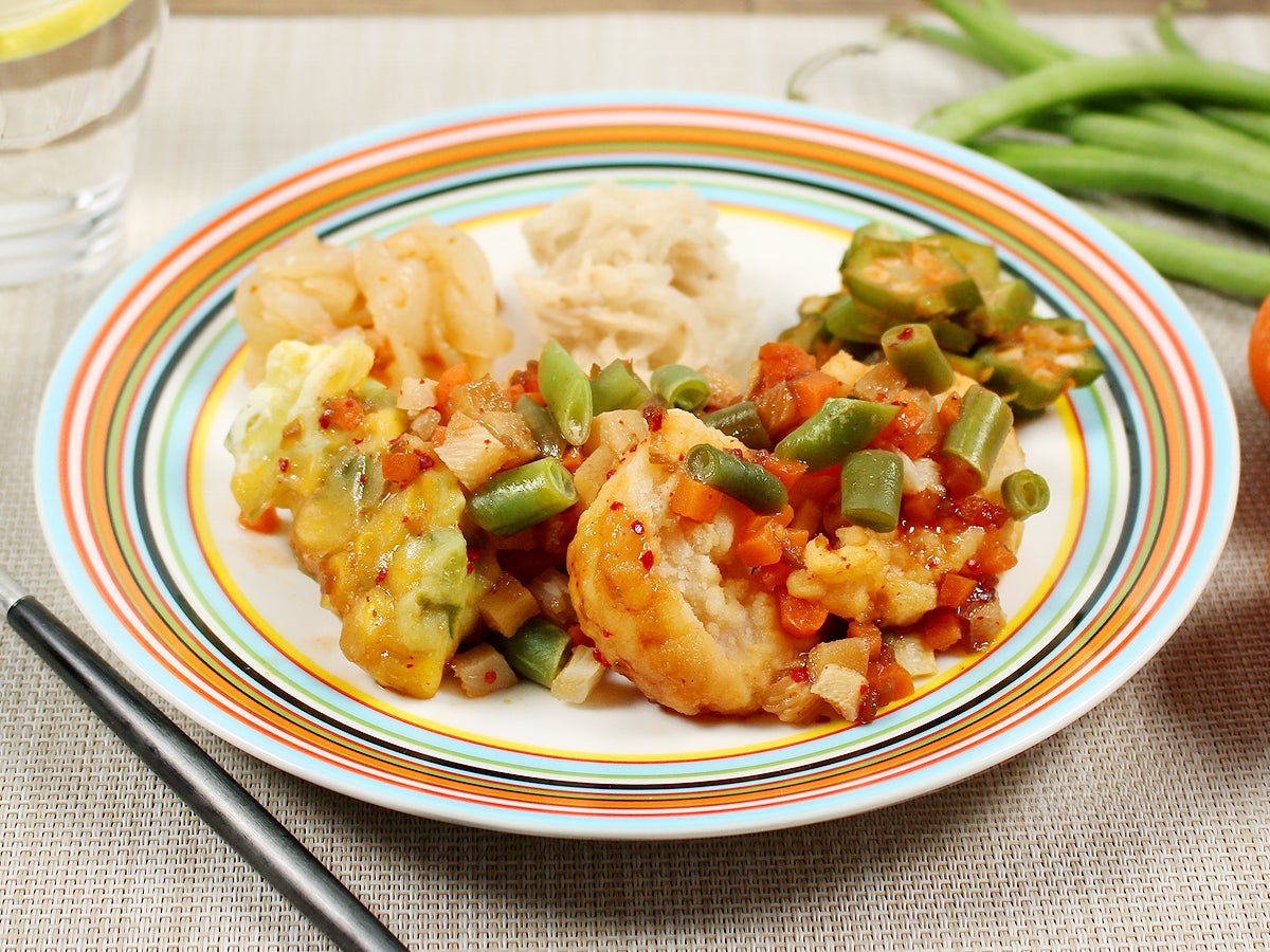 ふわふわのエビフリッターとコーンとアスパラの寄せ揚げに、香味野菜がたっぷり入ったピリッとスパイシーなソースをかけました。インゲン、タケノコ、人参をいろどりよく散らしております。ソースと具材をよく絡めてお召し上がりください。