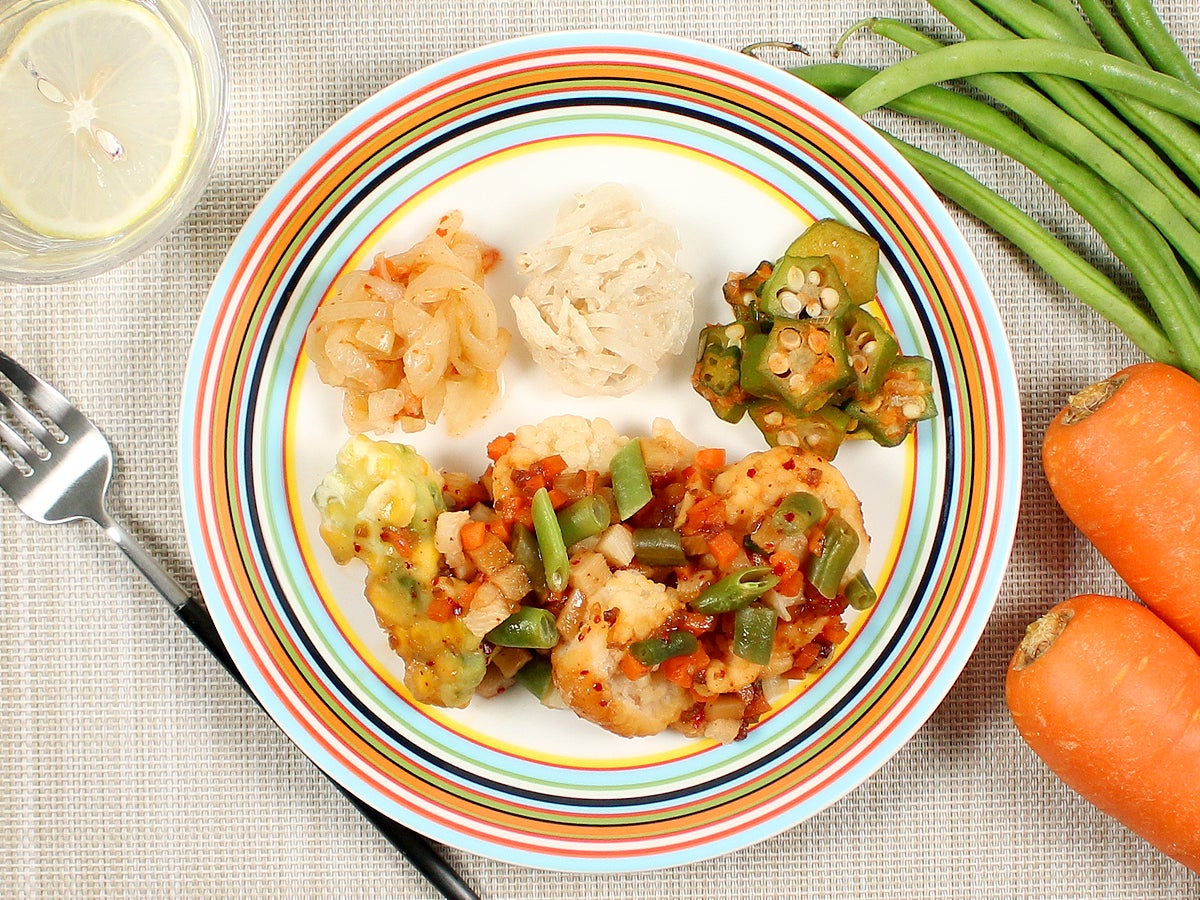 副菜は、玉ねぎの辛味あえ、大根の胡麻マヨ、オクラのチリソースです。
