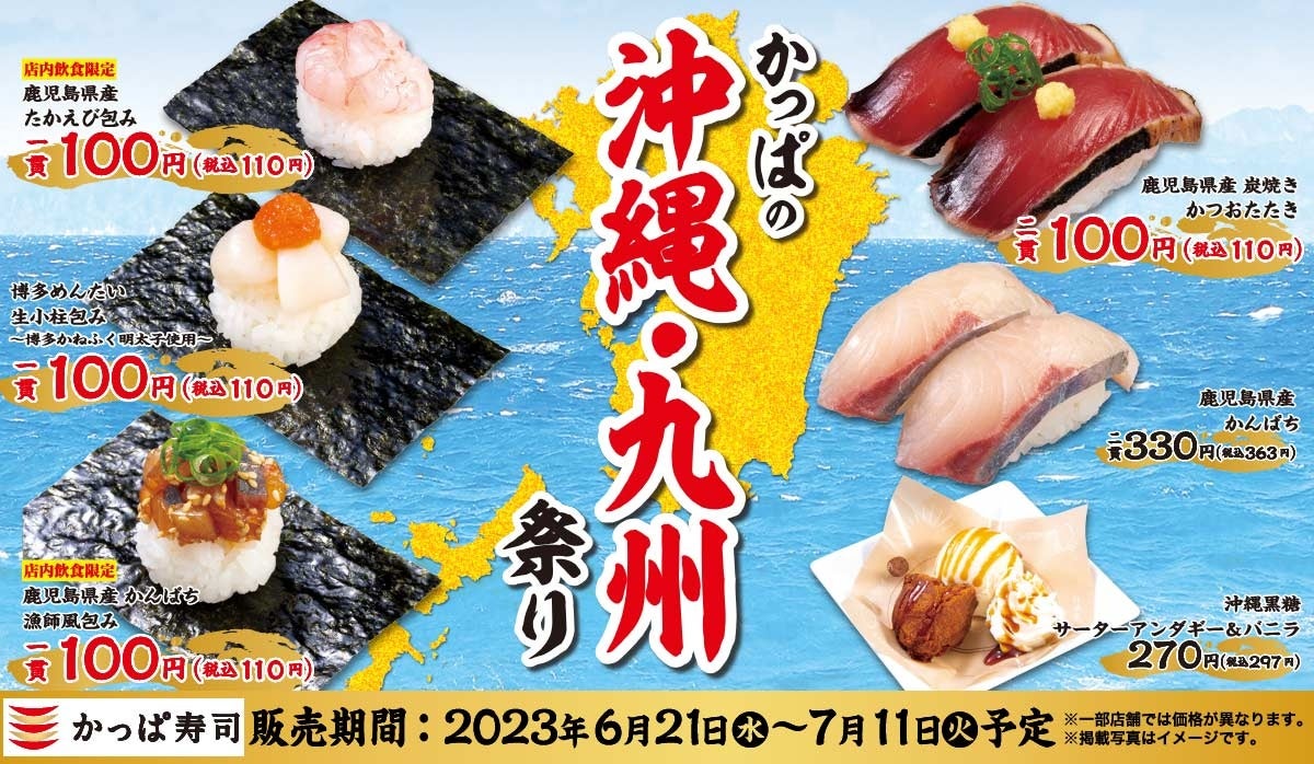 『かっぱの沖縄・九州祭り』では、沖縄の郷土料理「ラフテー」や九州福岡の老舗「博多かねふく」の明太子、 鹿児島県産の「かつお」や「かんぱち」など、沖縄・九州の名産品を使った寿司などを一皿100円(税込110円)よりご用意いたしました。その他には、「沖縄そば風ラーメン」「長崎県産アジフライ」、沖縄の縁起の良い菓子とされる「サーターアンダギー」など、かっぱ寿司で沖縄・九州のグルメ旅気分を味わえる全20品です。