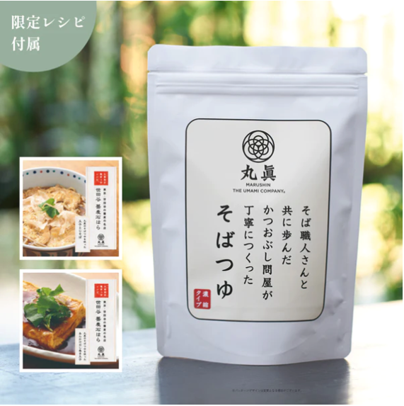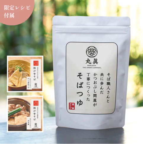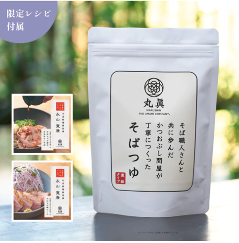 鰹節問屋である丸眞が試作を重ね、そばを知り尽くした職人も認める「そばつゆ」が完成。クラウドファンディングサイトのmakuakeでは2023年3月にプロジェクト達成率1000%超えを達成した注目の調味料です。